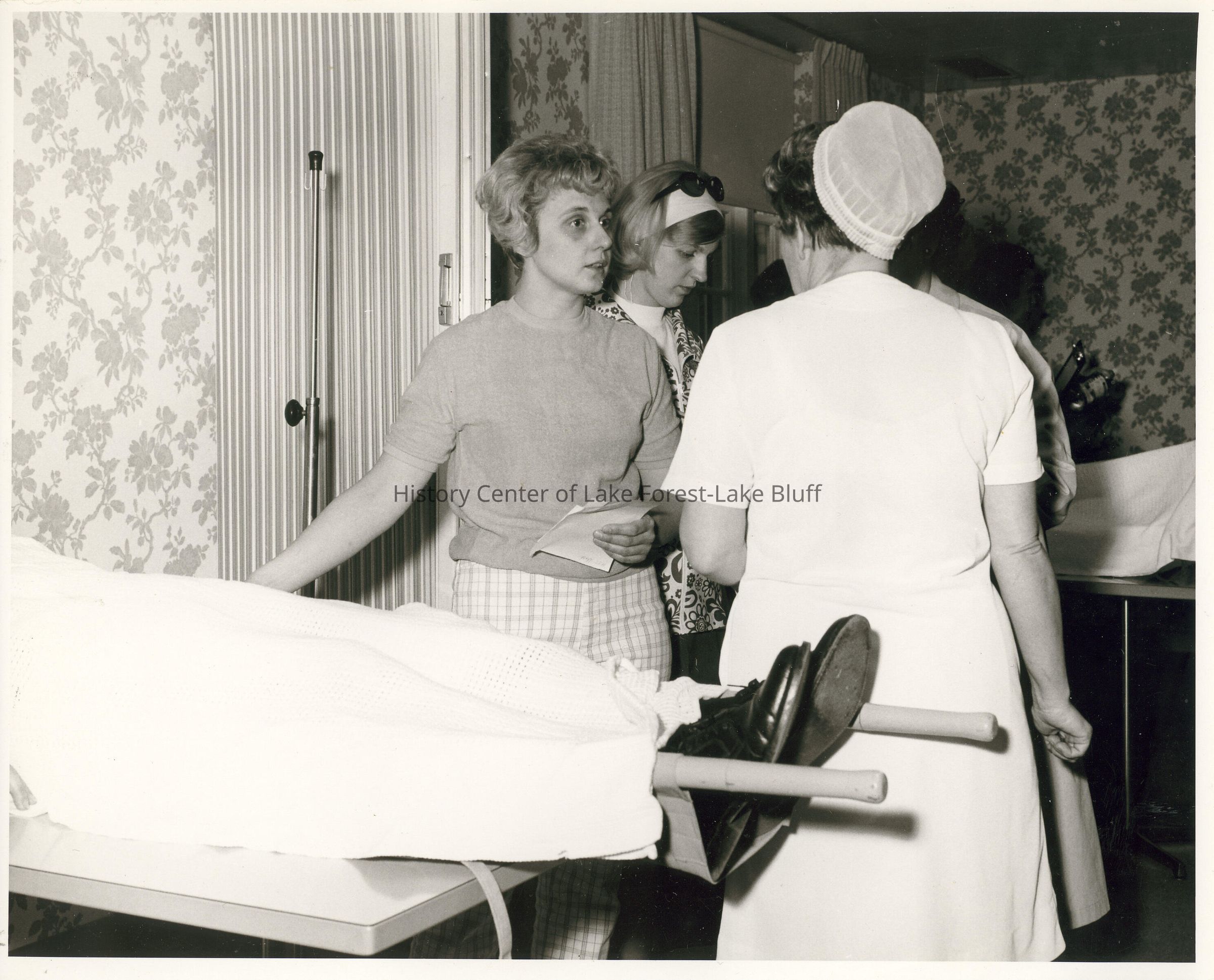 Three women near stretcher with male patient. Judy Boose Sick, RN on left.Folder labled Disaster Drill.