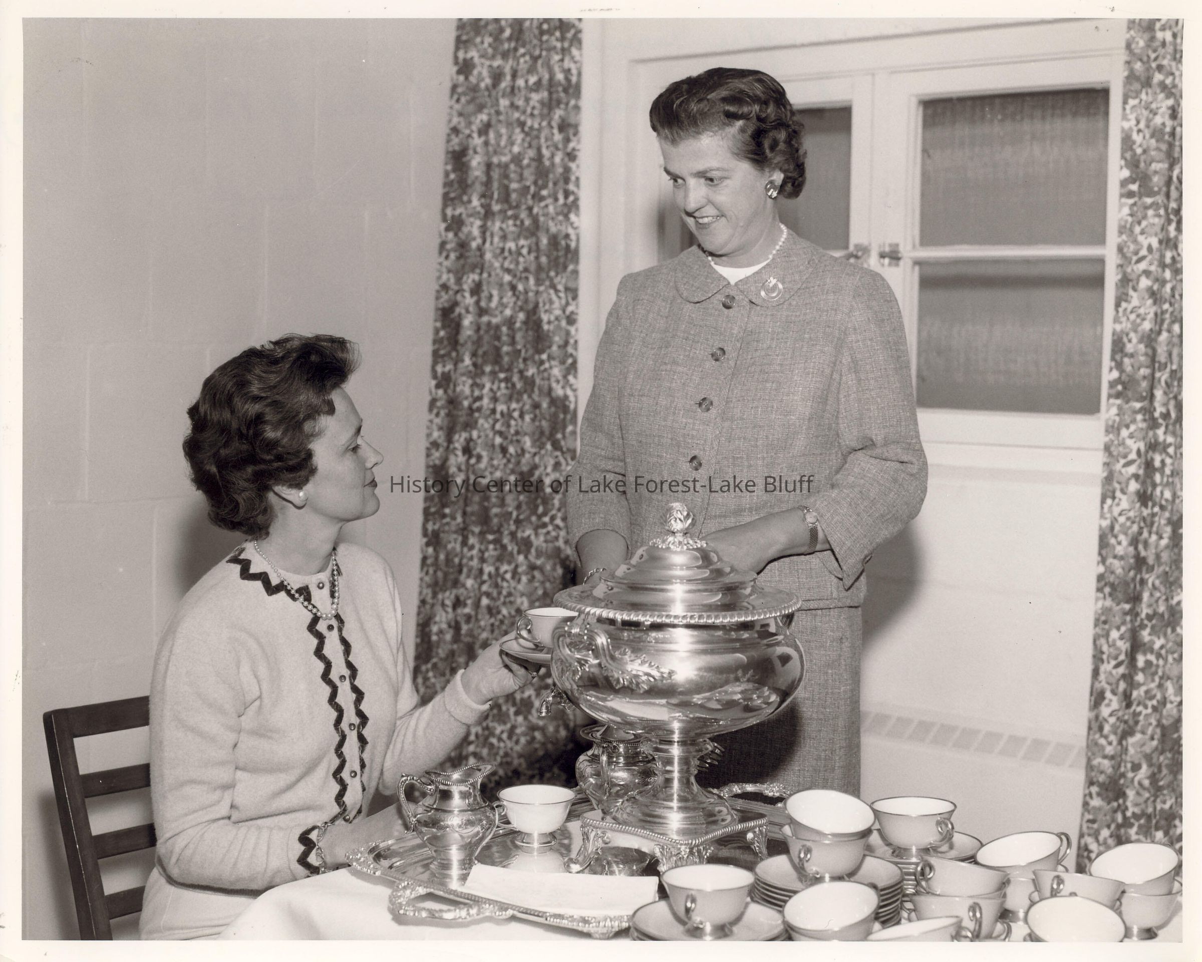 Women's Auxilliary: Two women with coffee set. Photo caption says coffee urn donated in memory of Mrs. Dunlap Smith (sister of Mrs. A.B. Dick, Jr.). Pouring is Mrs. Smith's daughter, Mrs. Radford Van Ness with Helen Dick Bronson.