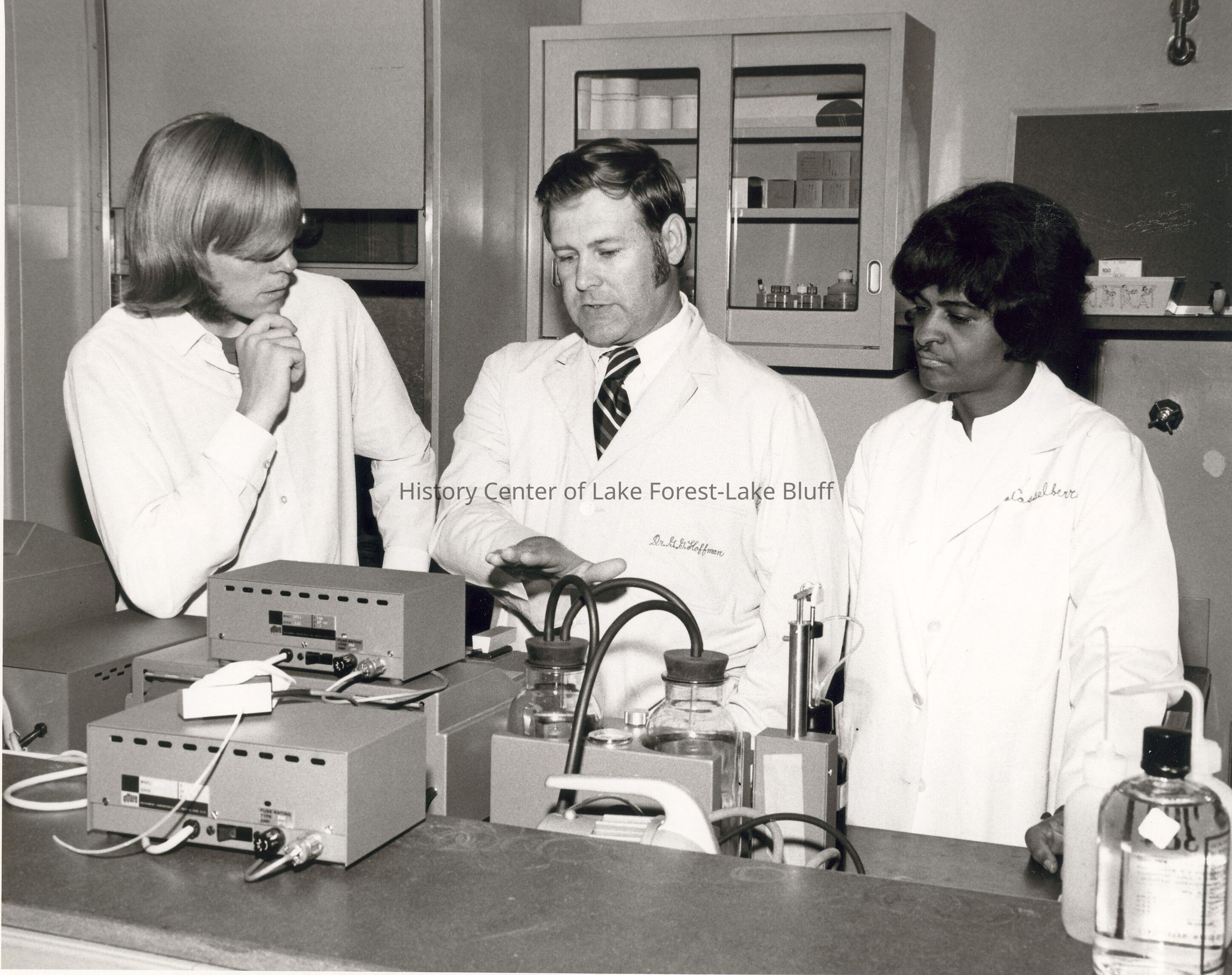 Dr. Hoffman, Mrs. Casselberry and unidentified male looking at a piece of equipment.