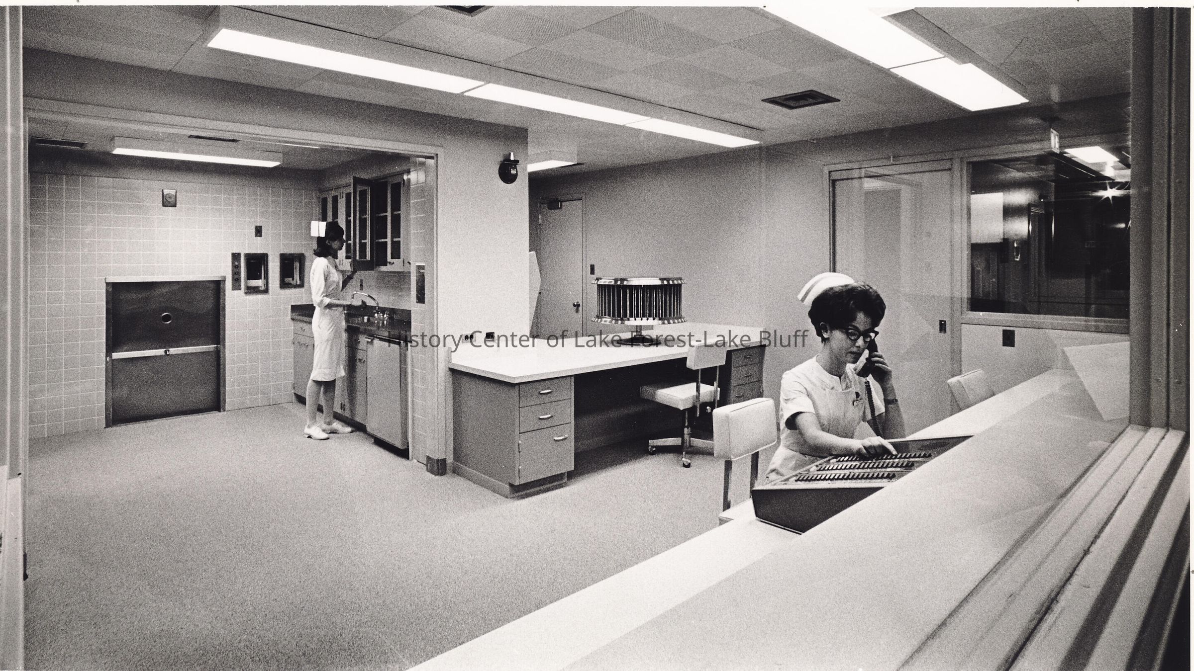 Two nursese, one at controls and one at a cabinet.