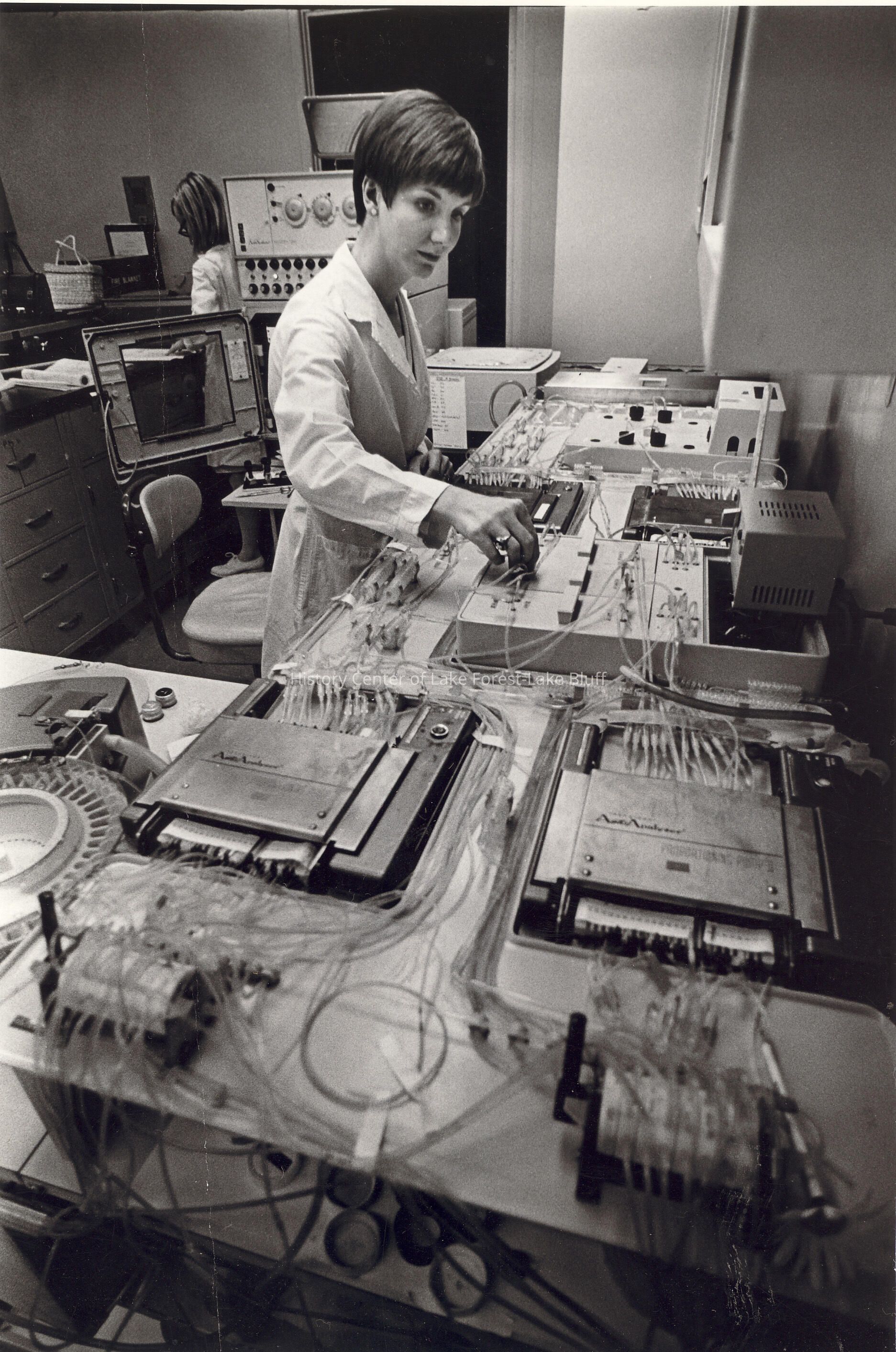Female technician at the controls of Auto Analyzer.