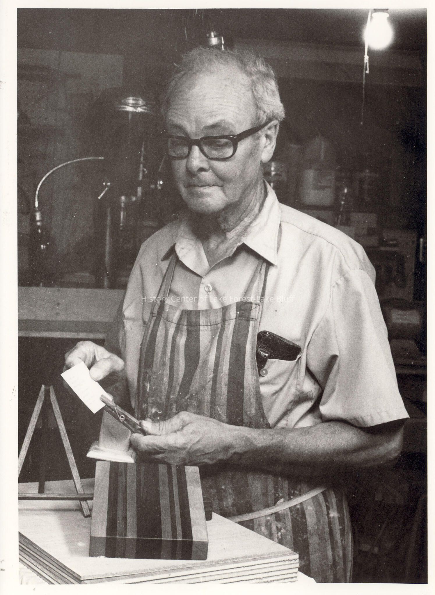 Women's Auxiliary: Older man in workshop holding clothes pin.