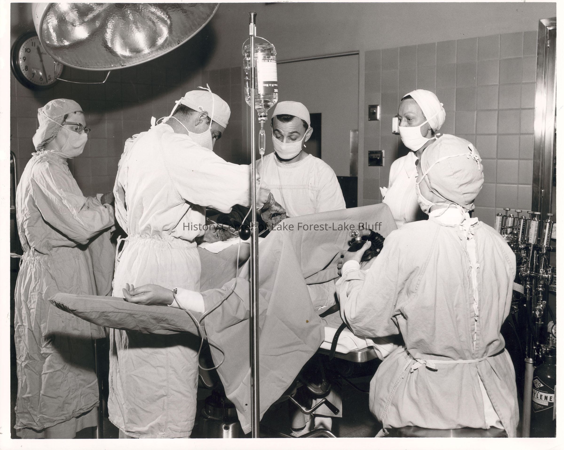 Operating Room. Male surgeon assisted by one other male and three females.
