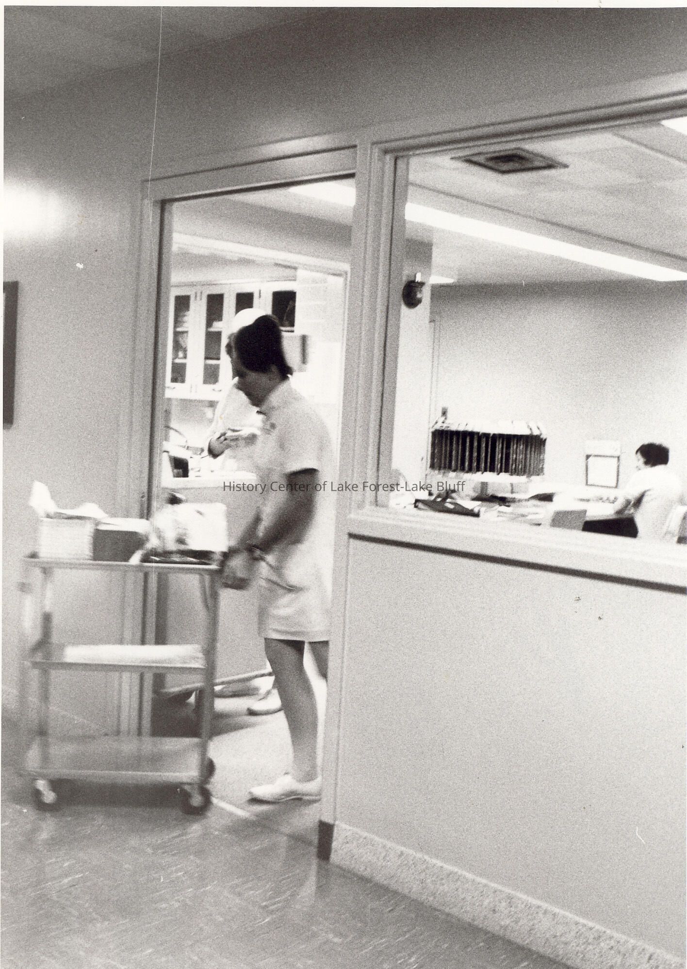 Nurse pushing cart out of doorway.