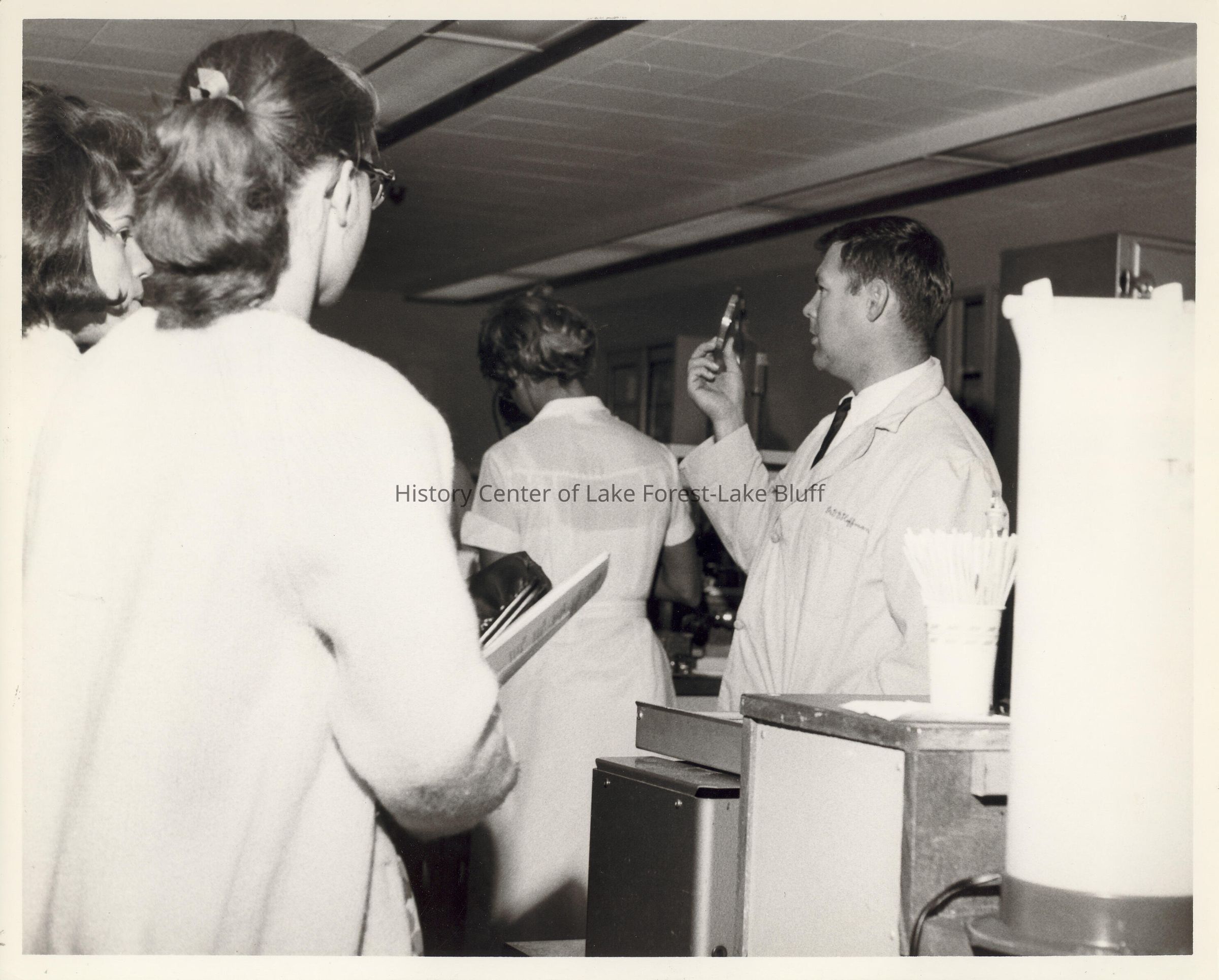 Dr. Gerald Hoffman, Pathologist holding what appears to be a petri dish in a room with 3 female clinicians.