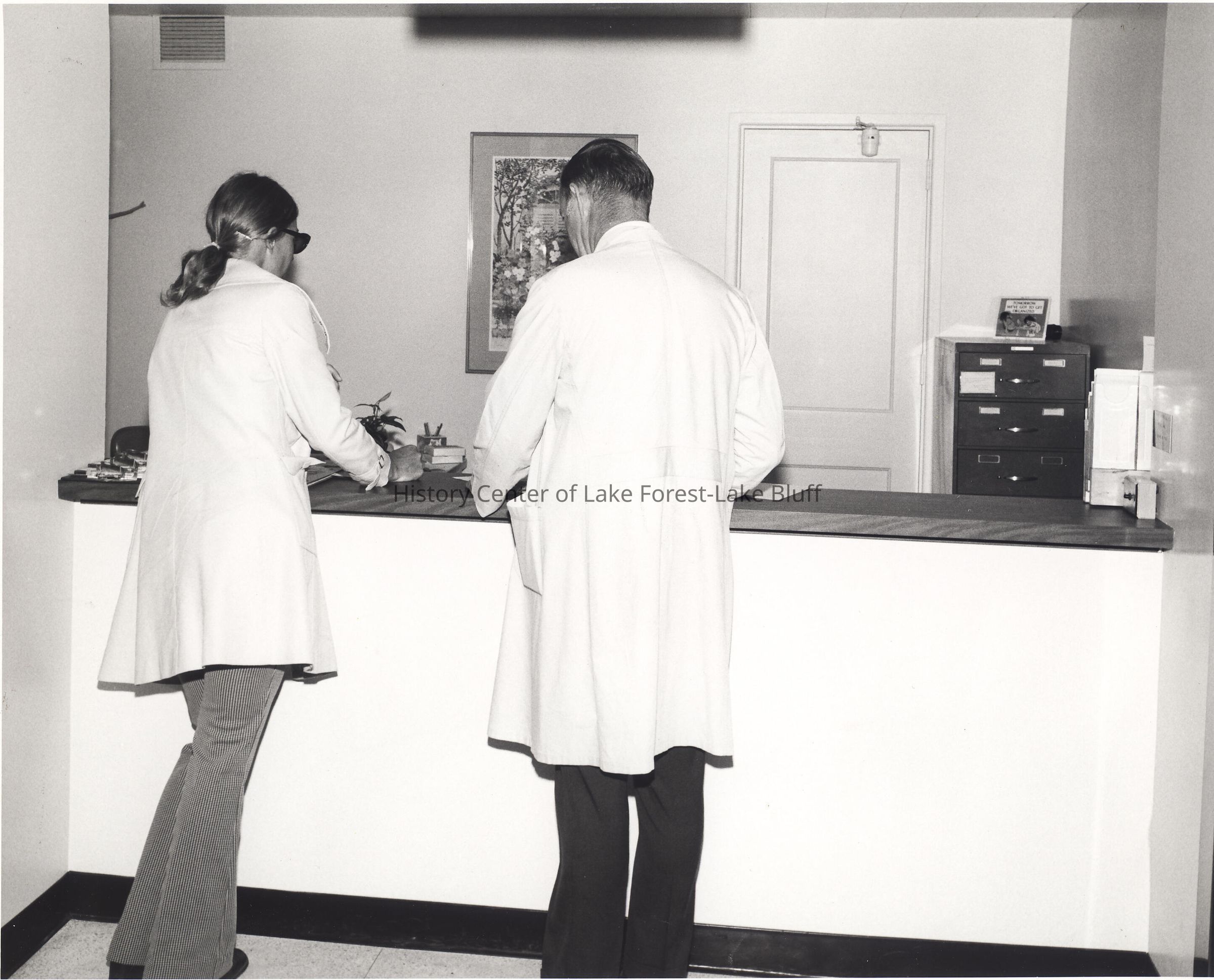 Man and woman, both in lab coats, standing. Photo has John McHugh listed.