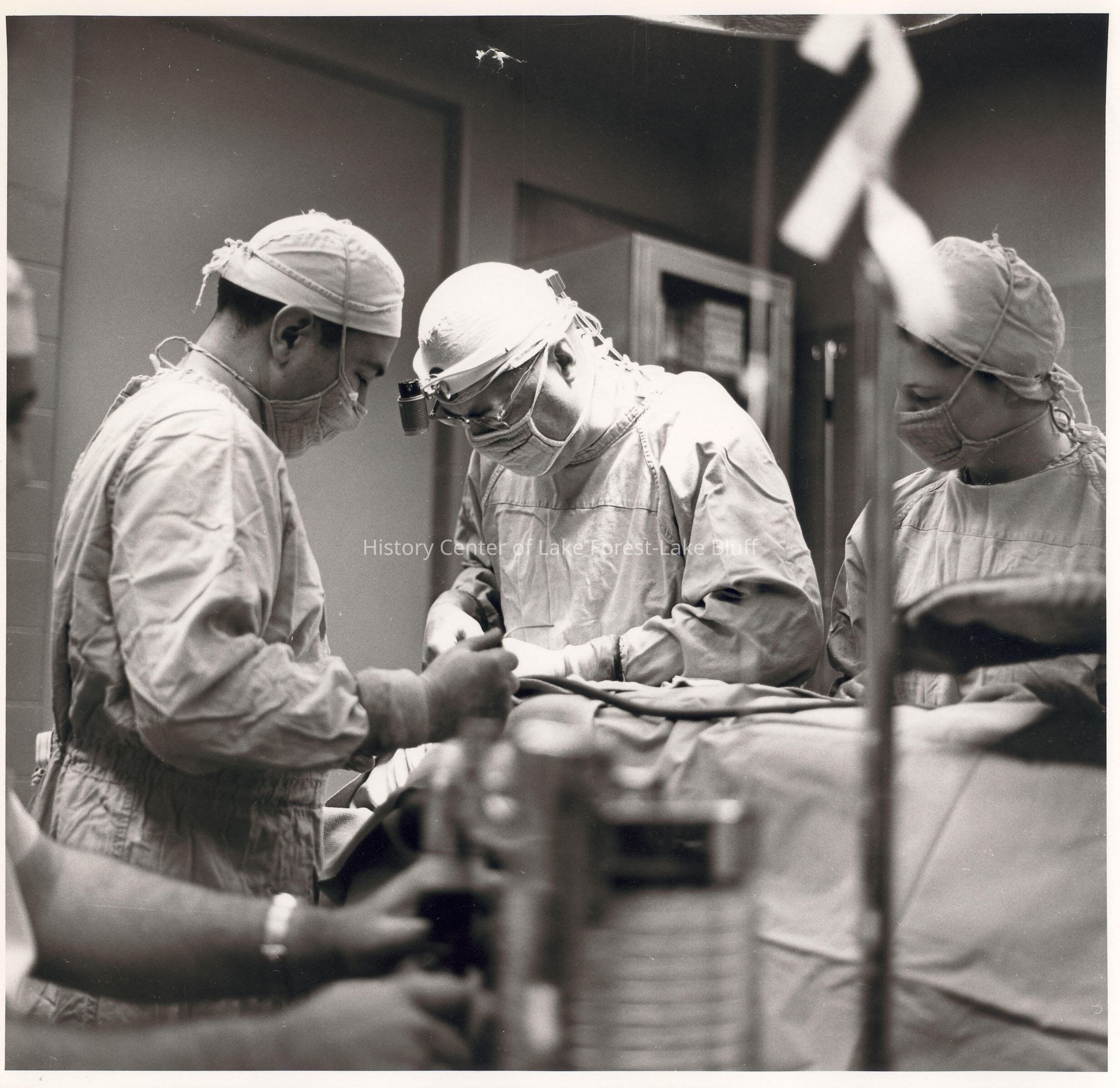 Two male surgeons assisted by female OR nurse.