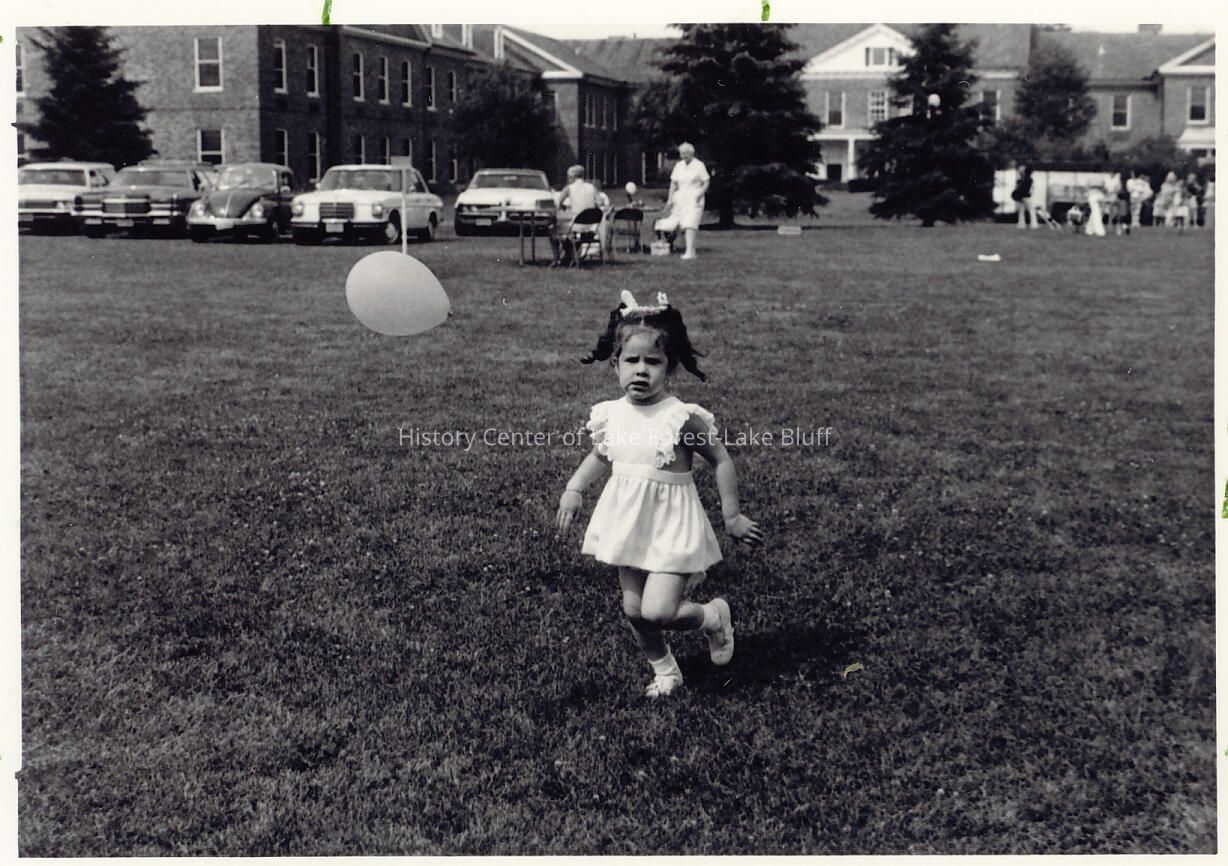 Young girl running on lawn in front of hospital at Baby Alumnae party.