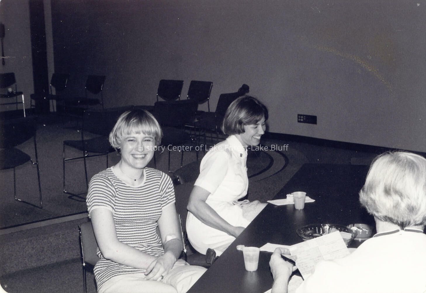 Three women, two in clinical outfits, seated at a table in a conference room. Blood Typing and Donation.