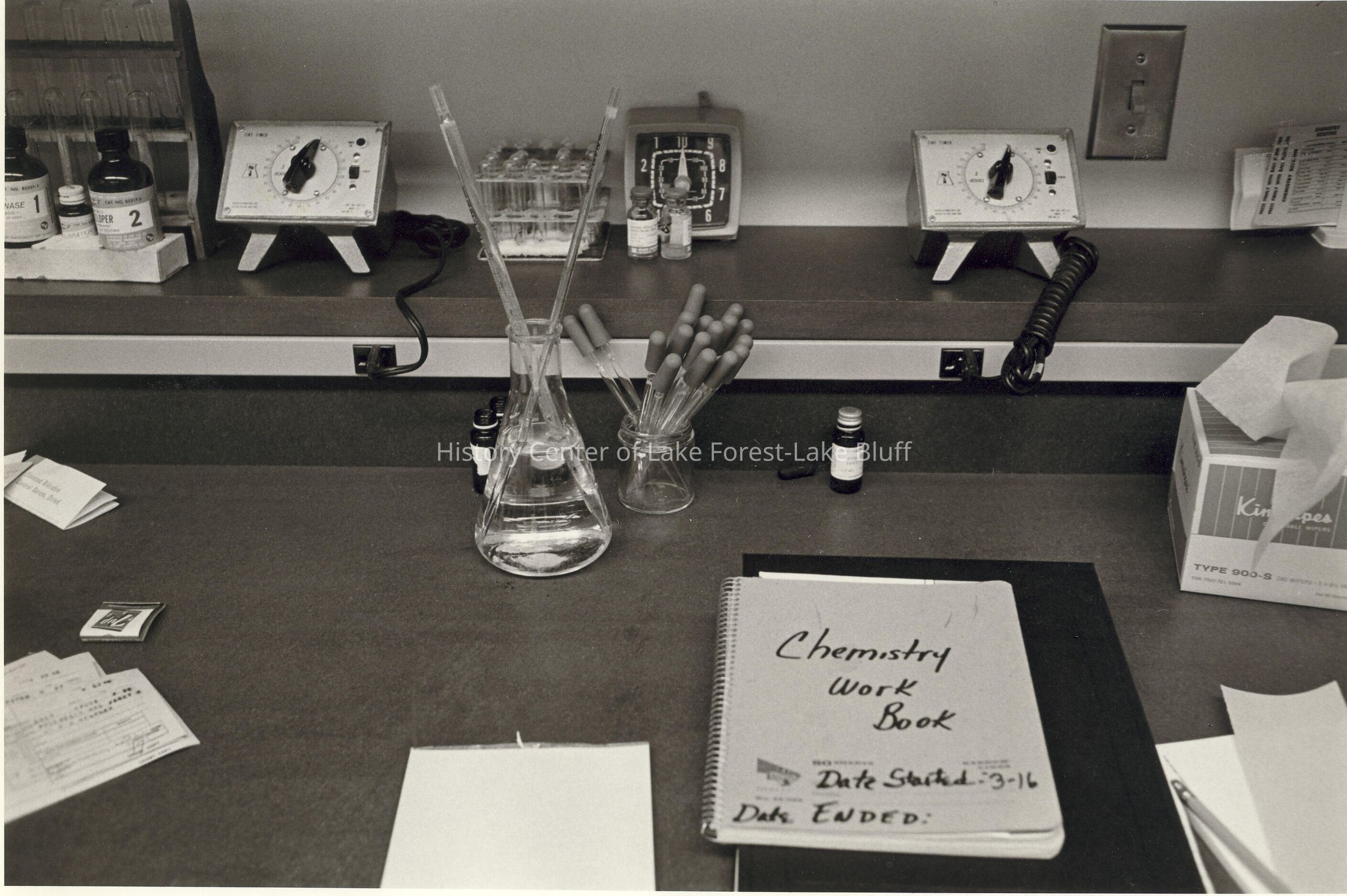 Beaker with pipettes and Chemistry workbook.
