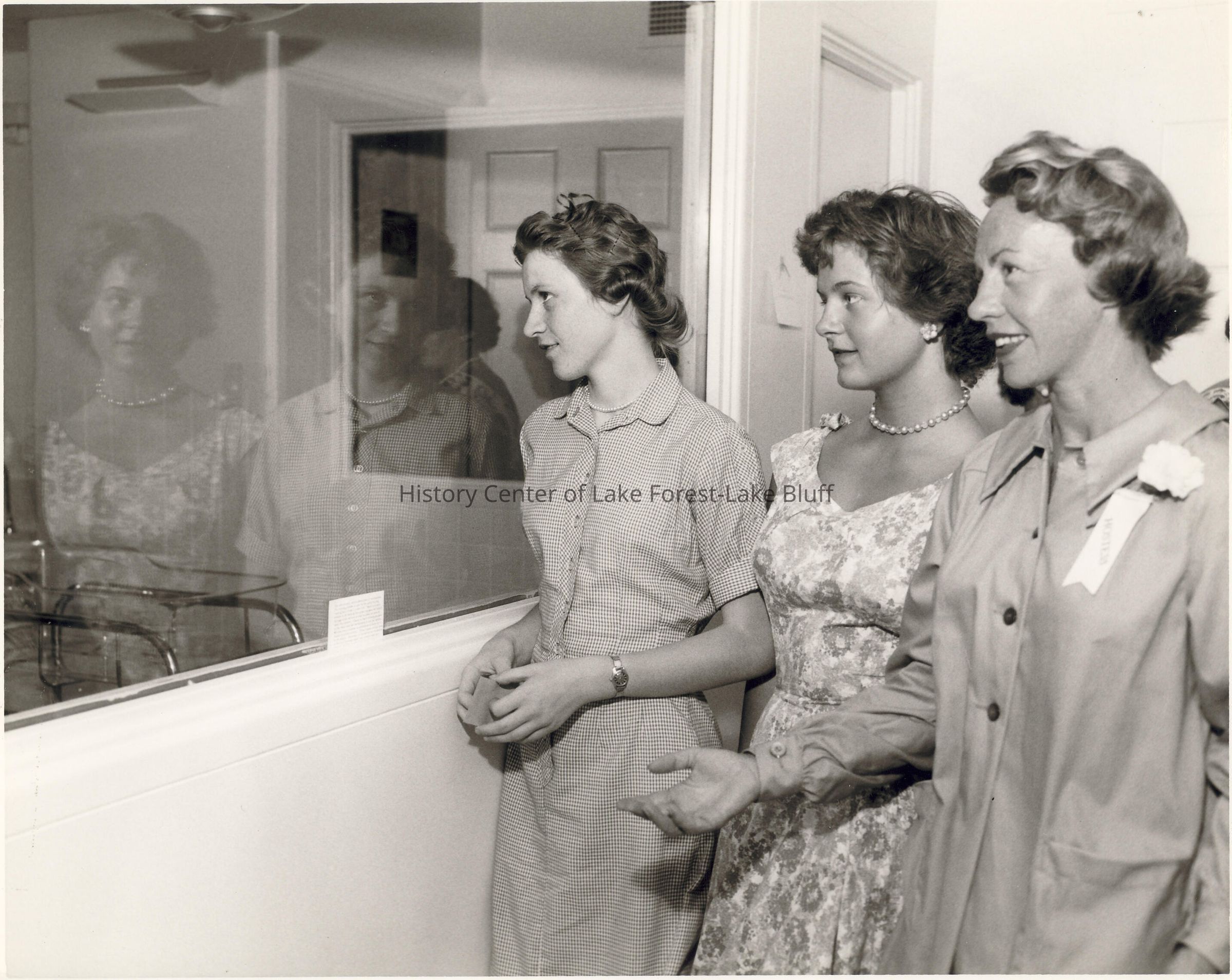 Three women, one dressed as a volunteer, presumably looking through window into the nursery.