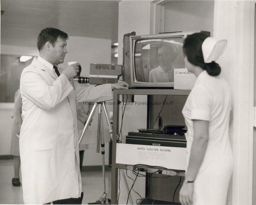 Dr. Hoffman and female nurse looking at TV monitor which presumably displays videotape recording.
