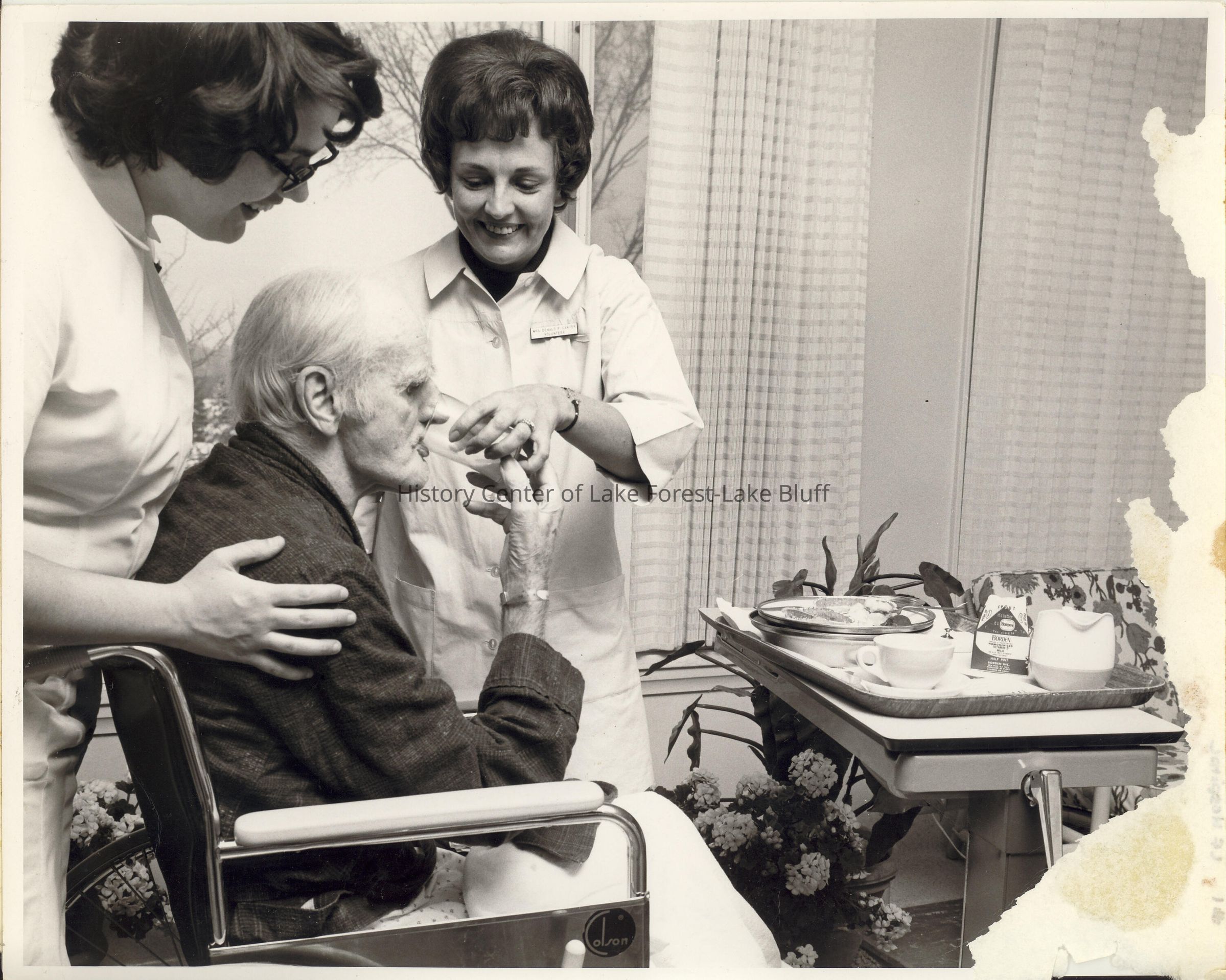 Two female volunteers helping elderly male patient in a wheelchair drink from a glass.