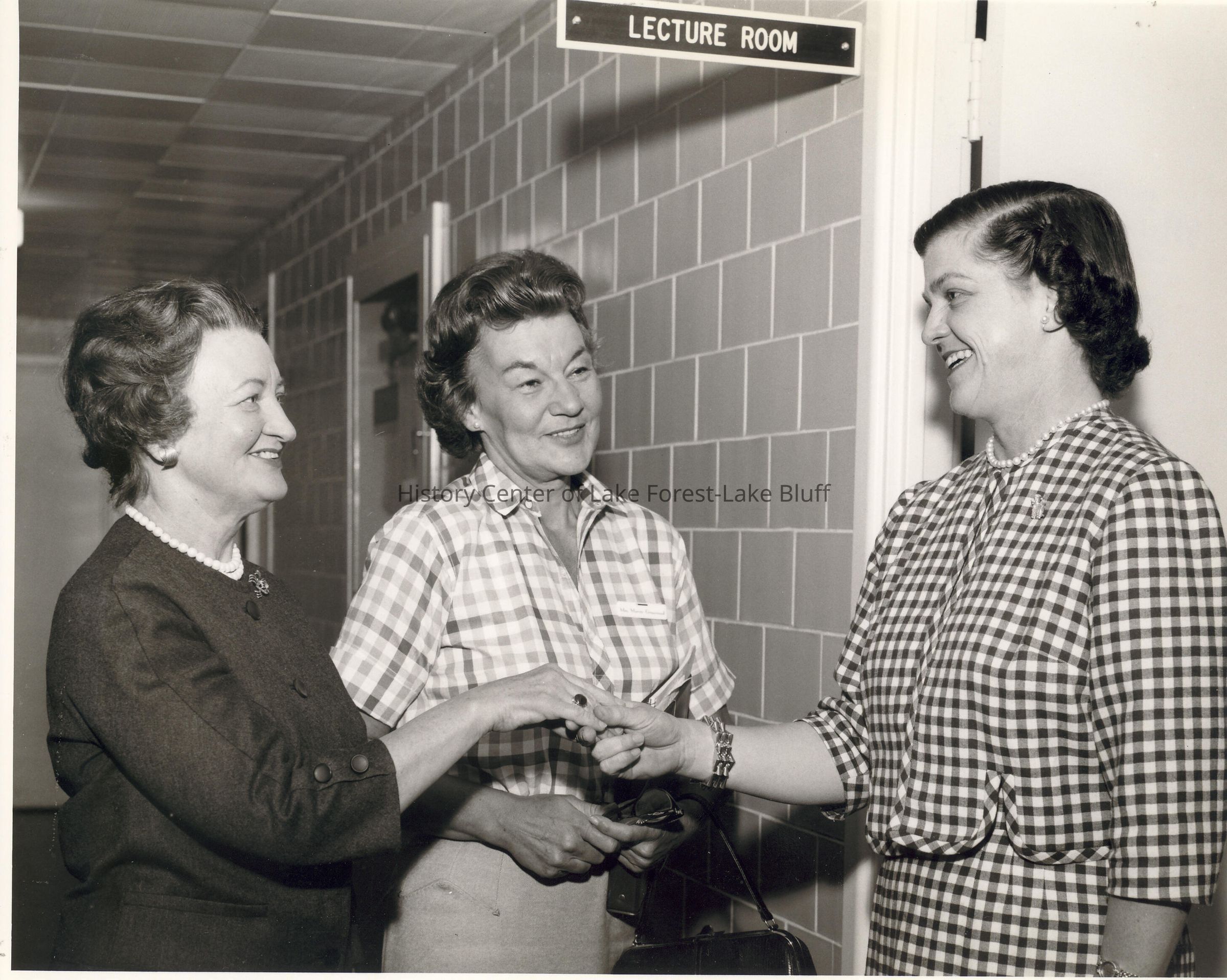 Three women standing outside Lecture Room. far right is Helen Dick Bronson