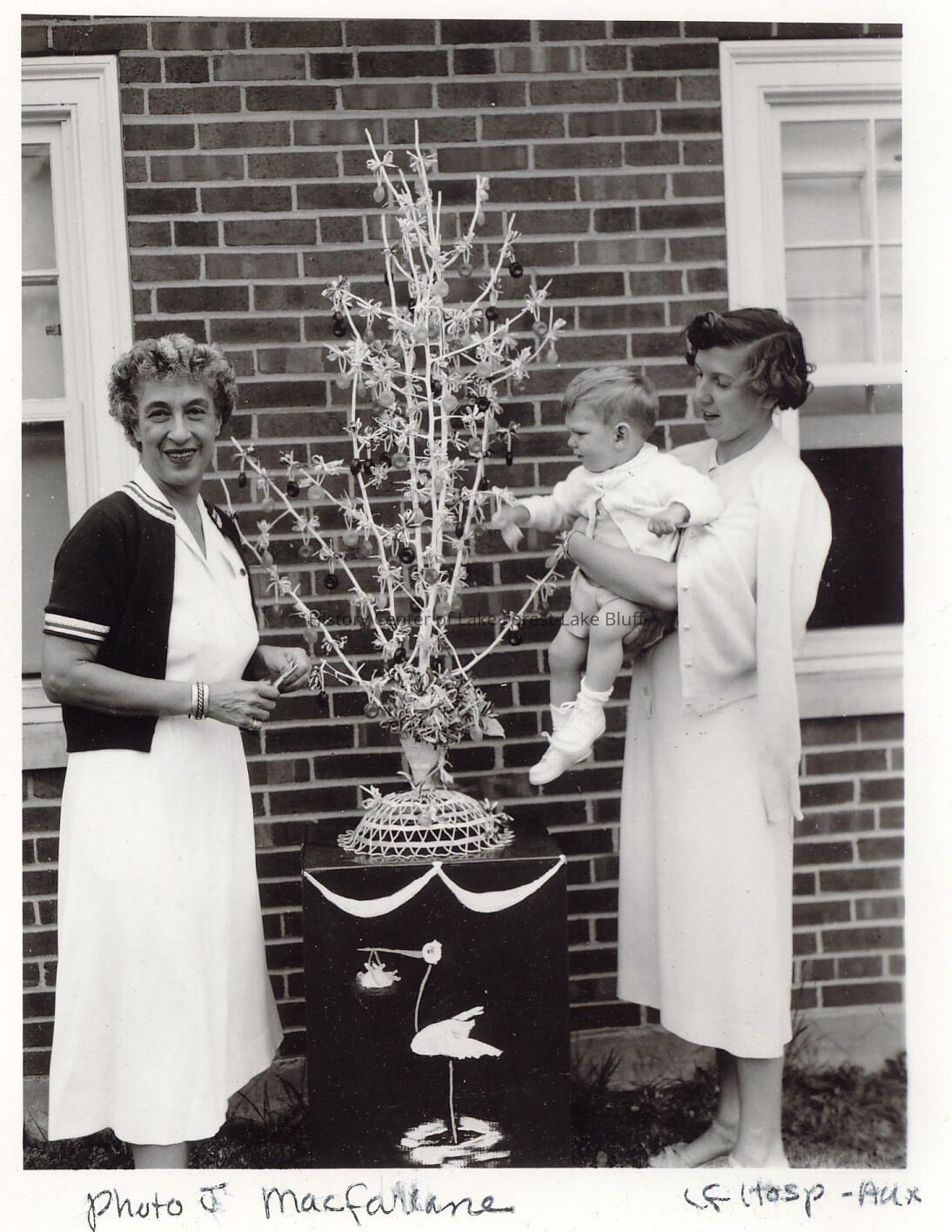 Two women holding baby at what is presumably Baby Alumnae gathering. Woman identified at Mrs. Phil Reddy and Mrs. Bruce Macfarlane and son.