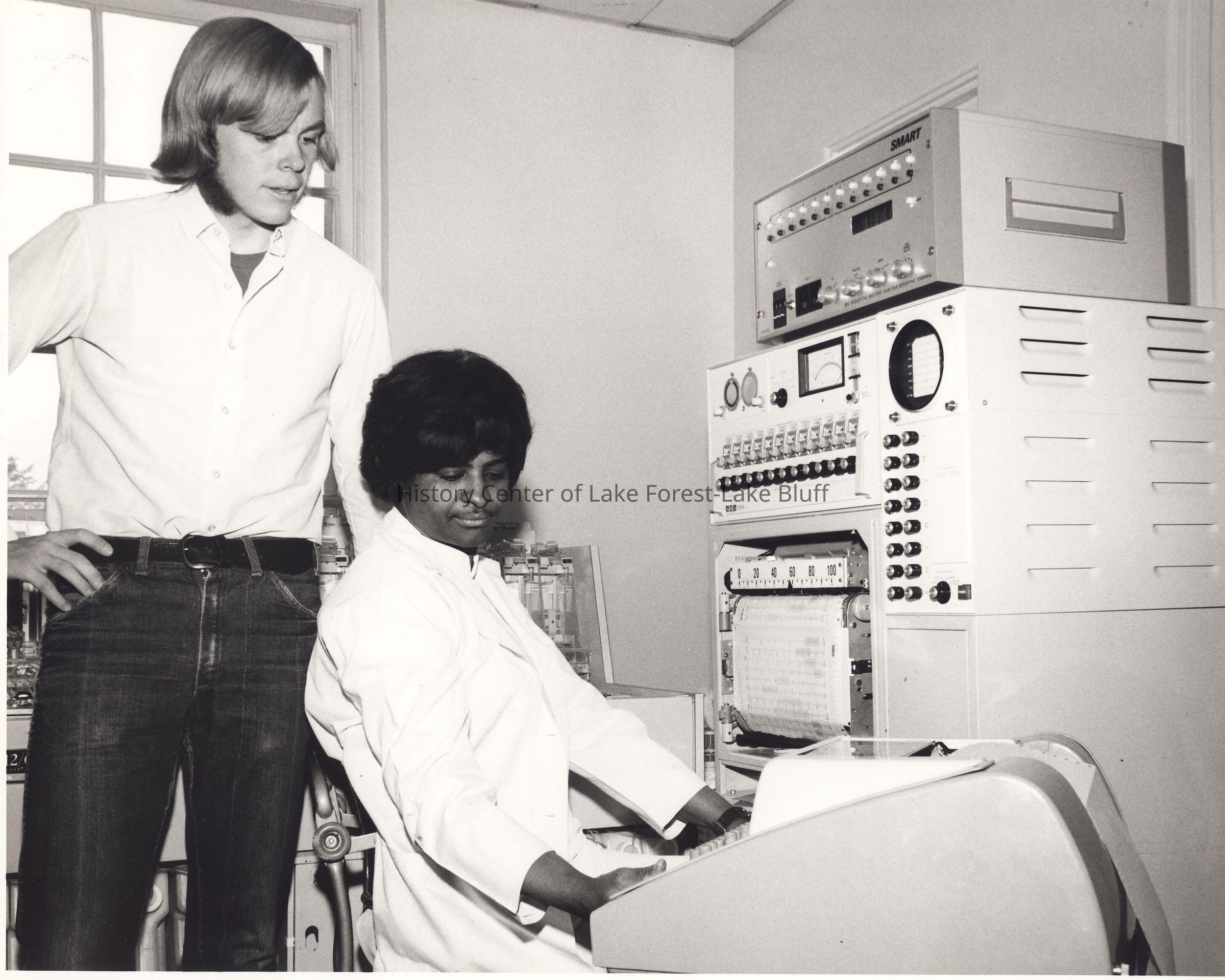 Blood Typing and Donation. Mary Casselberry and man in jeans looking at results coming off printer.