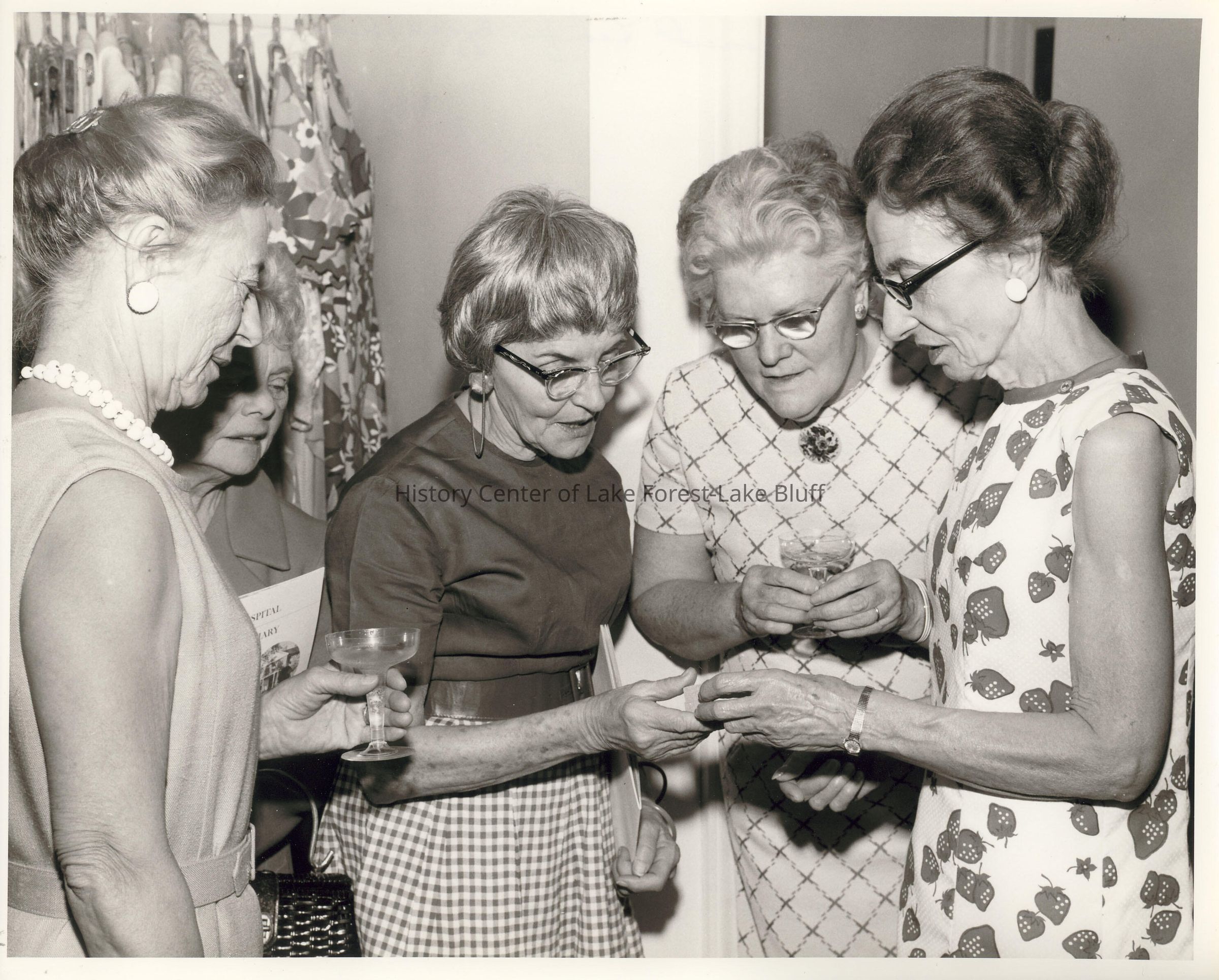 Women's Auxilliary. 1973 retirement party for Effie Hiscox. Five women looking at an award. Helen Graham, second from right.
