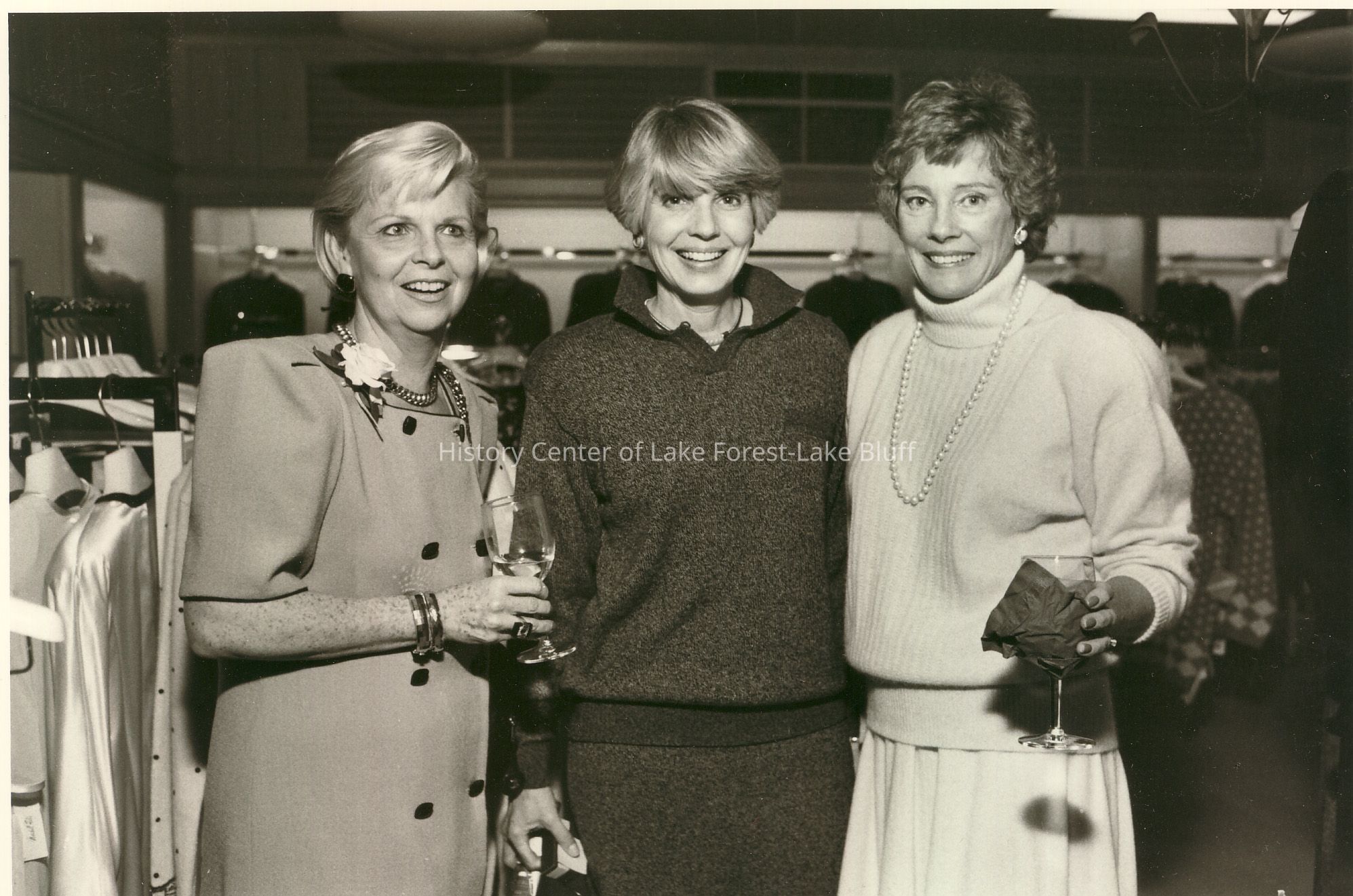 Three women stand together, smiling, while holding drinks at a clothing store event.