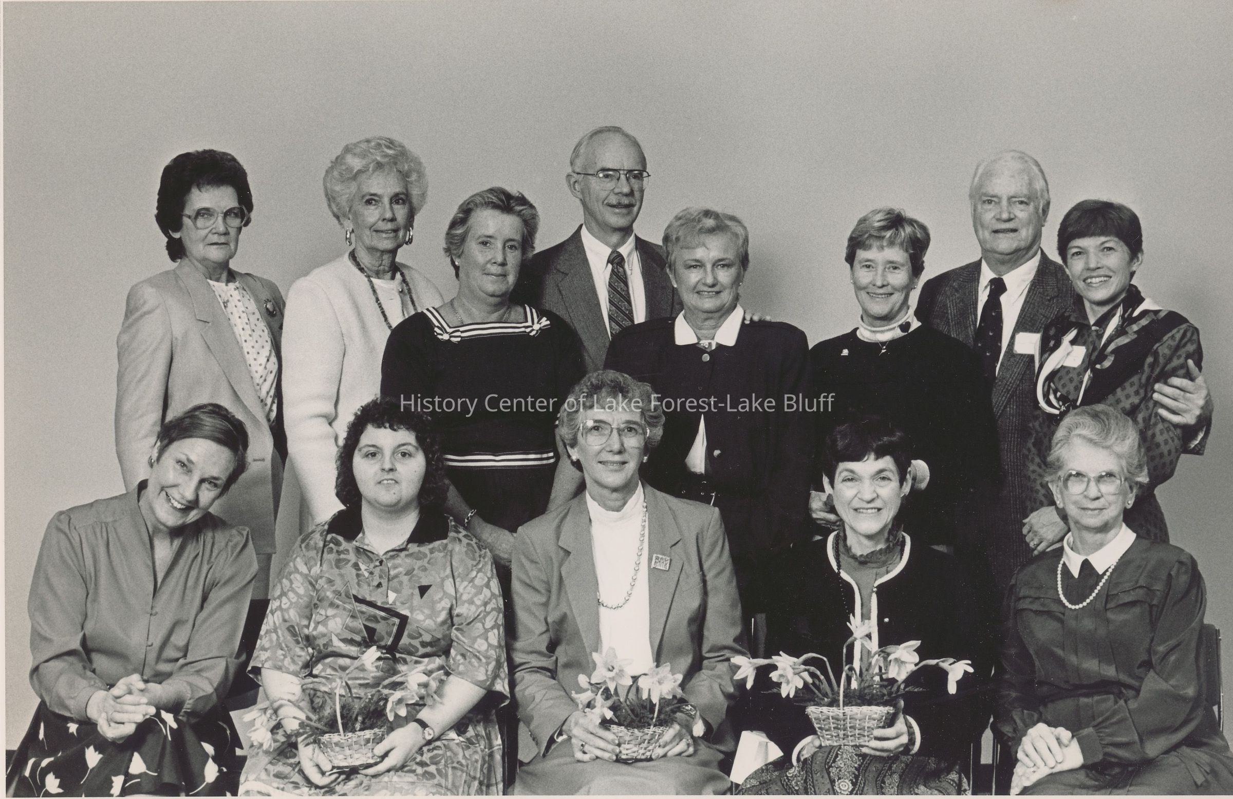 A group of men and women pose together, some holding flower baskets, smiling for the camera.