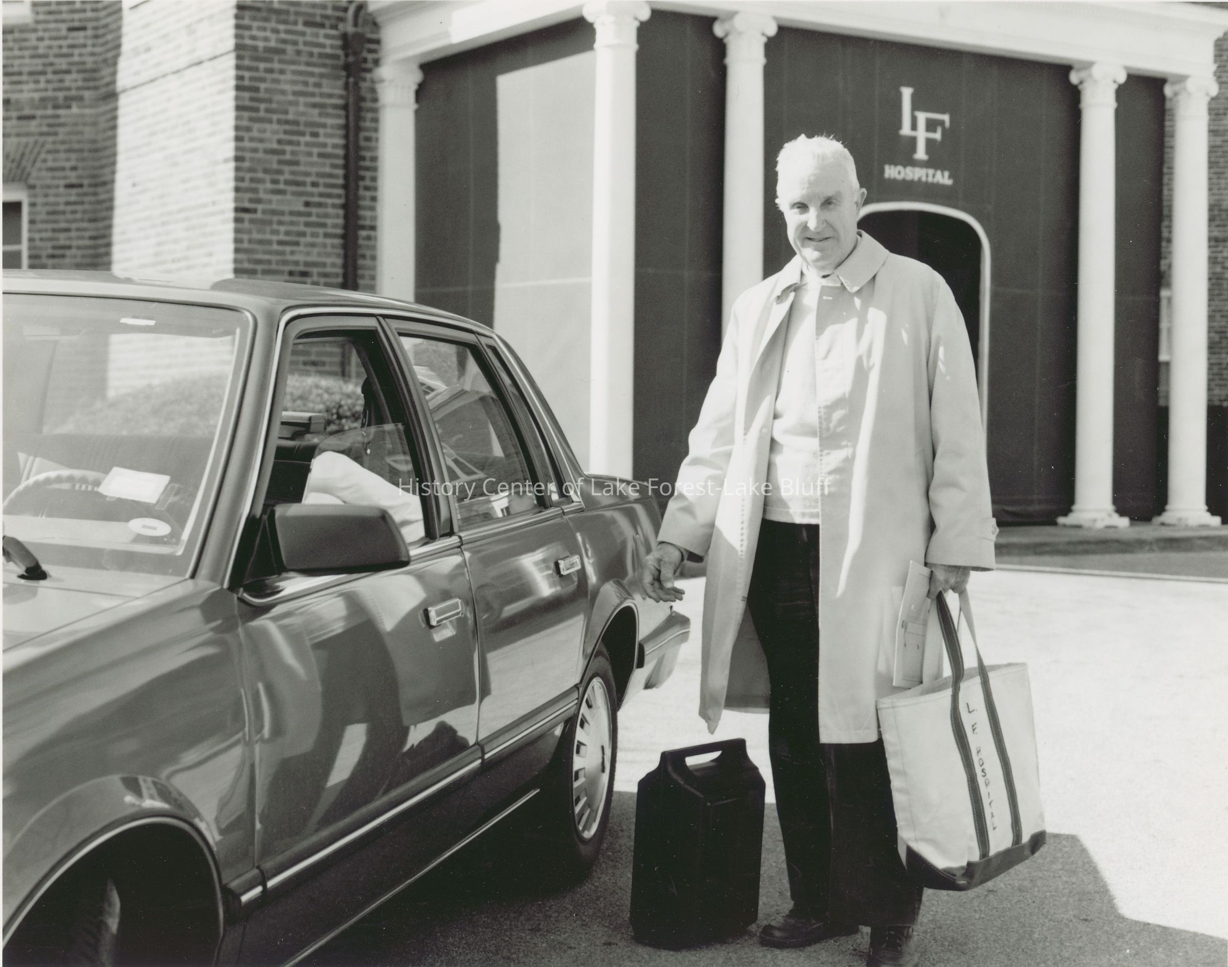 An elderly man stands beside a parked car outside a hospital, holding two bags.