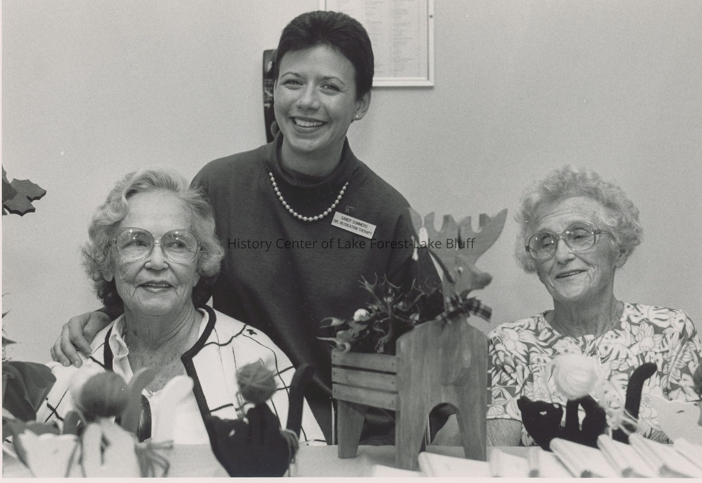 A smiling woman stands behind two elderly women, surrounded by decorative items on a table.