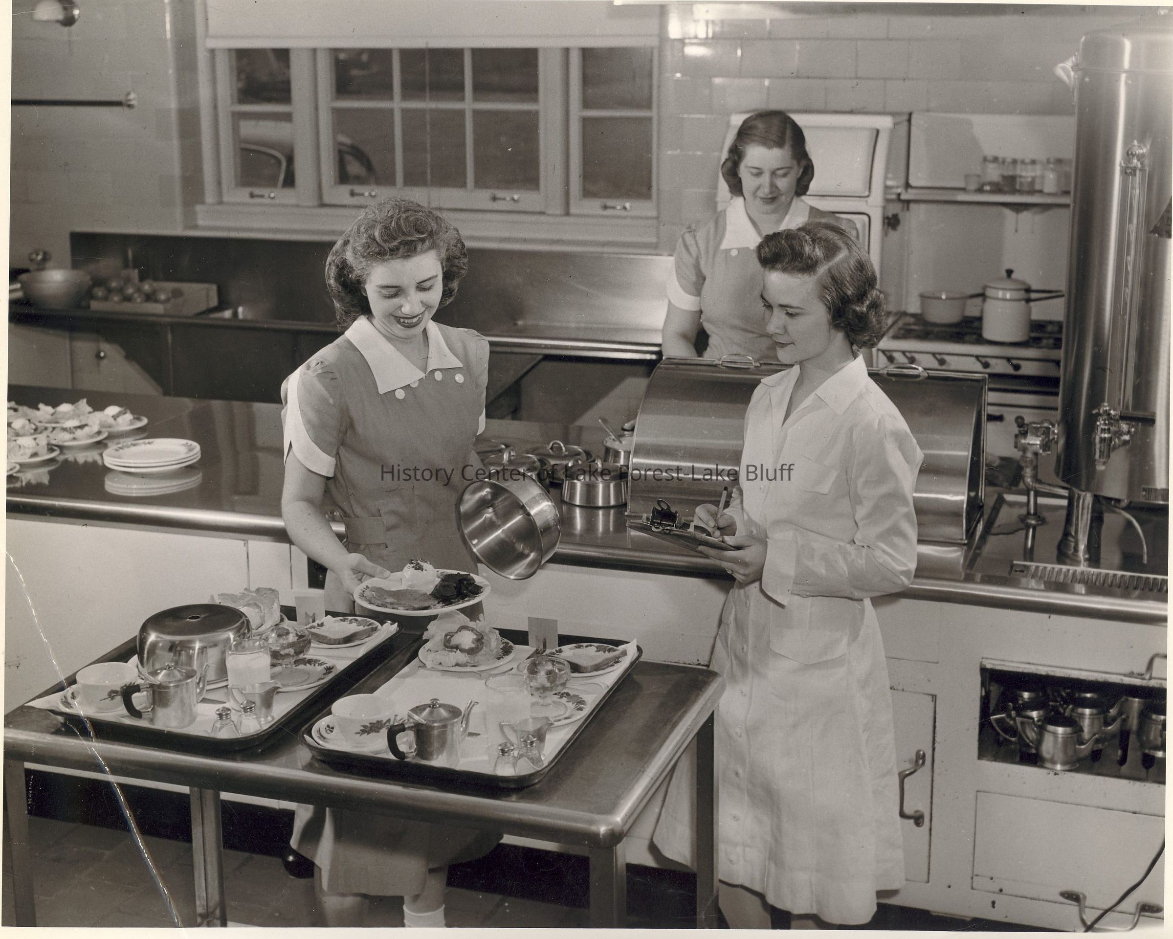 Three food prep workers assembling patient trays in kitchen.