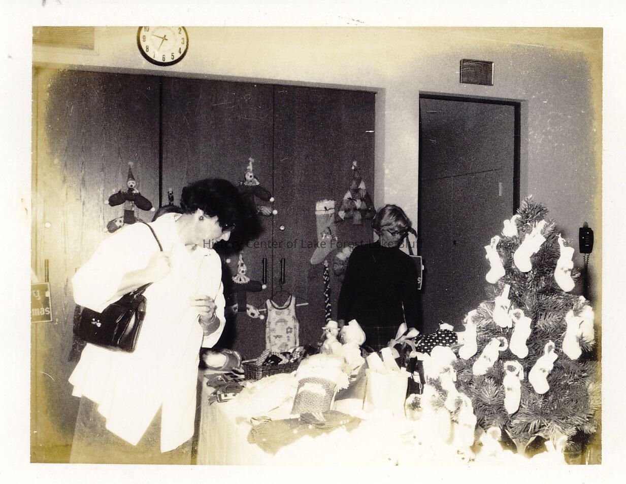 Women's Auxiliary: Two women looking at Christmas gifts on table at the Holiday Boutique.