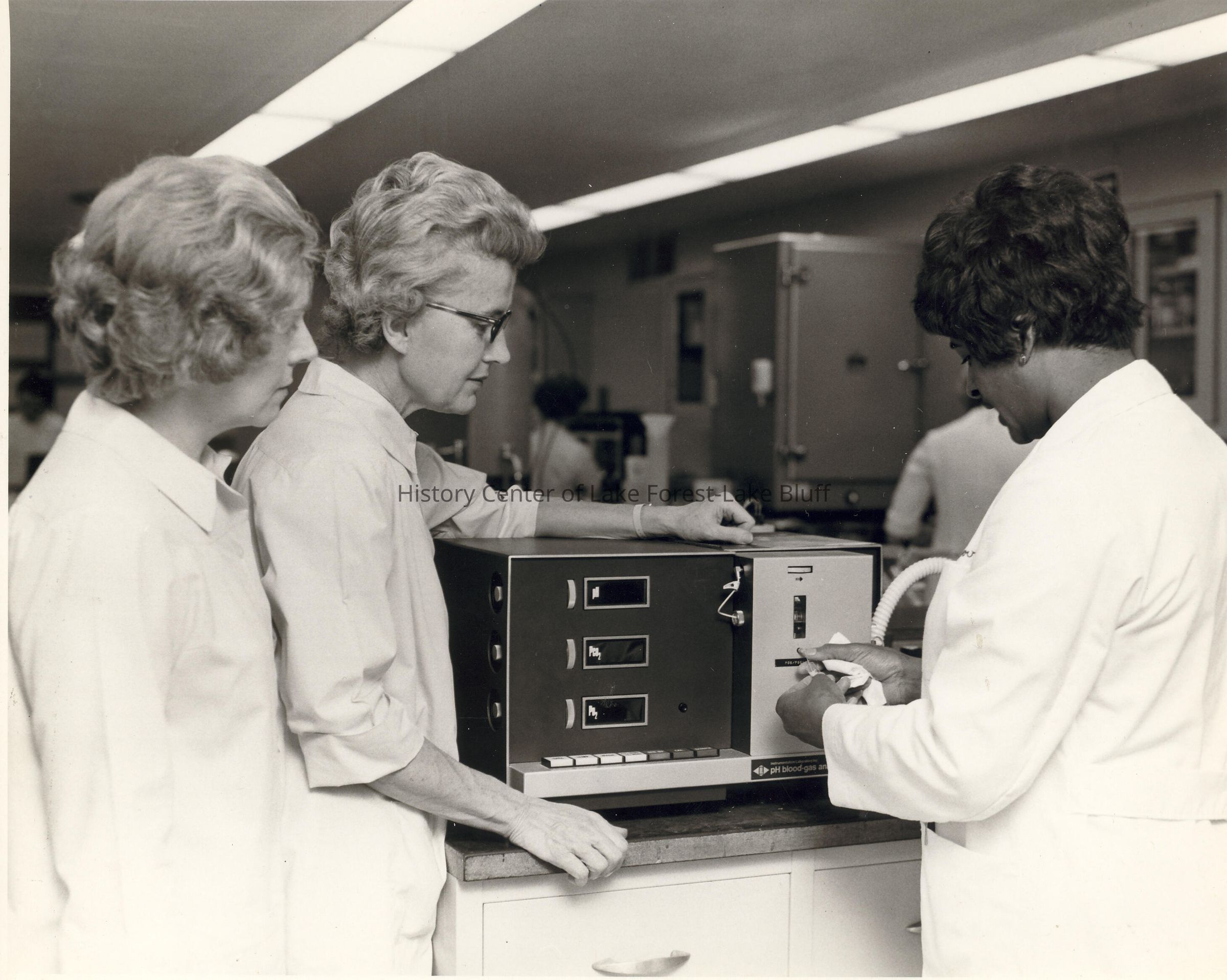 Volunteers: Three women in lab coats around blood gas analyzer. Mary Casselberry on right.