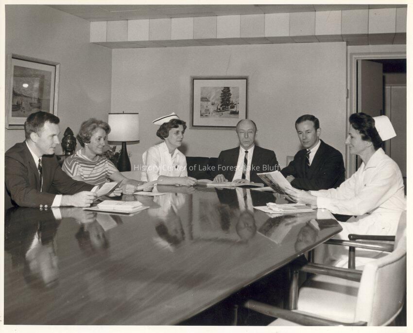 Homecare Committee 1966. Mr. Jerry Harris, Mrs. Alanson Donald, Miss Jean Stickels Director of Nursing, Dr. J.L. Ward, Dr. H. Falls, Mrs Mildred Horn RN.Made/Created