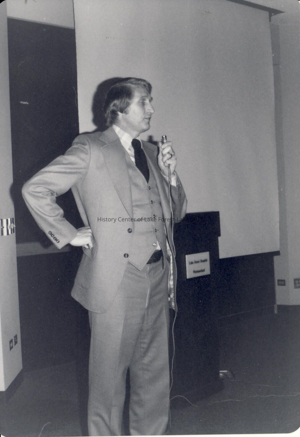 Man in suit, Dr. Ganshirt, holding microphone and speaking to a crowd.