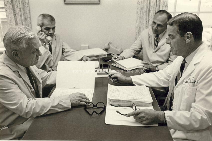 Dr. Paul Burgert, Dr. J.F. Lutz , Dr. Elmer Kadison and Dr. Owen McDonald seated at a table reviewing what are presumably patient folders.