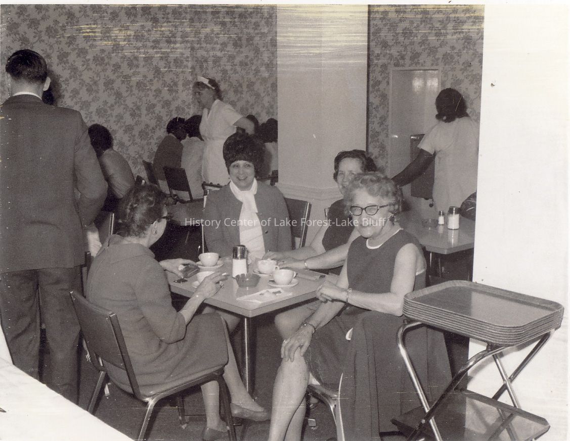 In a vintage cafe, people are seated, enjoying tea and conversation, while waitstaff attend to tables