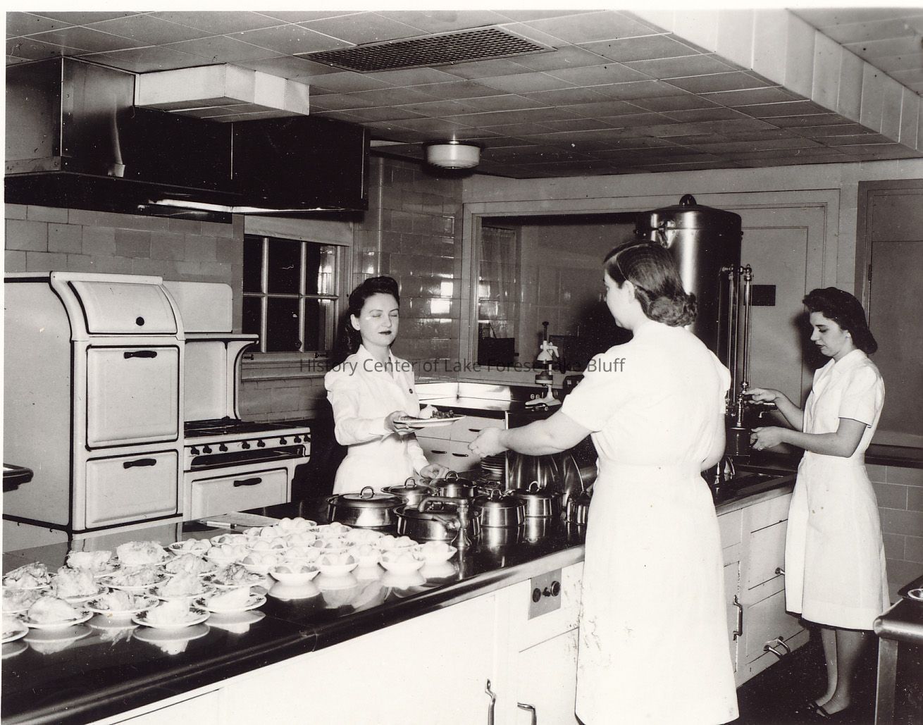 Three women in white uniforms are working busily in a vintage kitchen setting, handling food and utensils.