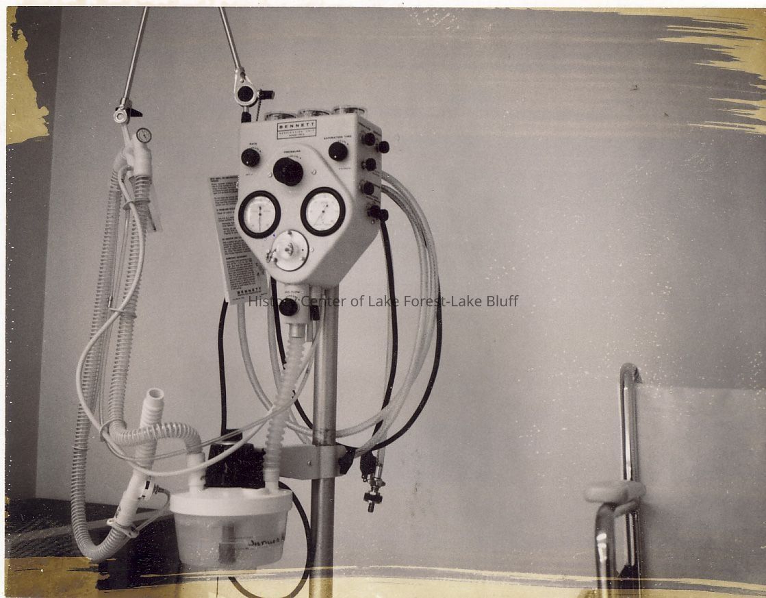 The image shows a vintage medical ventilator with tubes and dials beside a metal chair against a plain