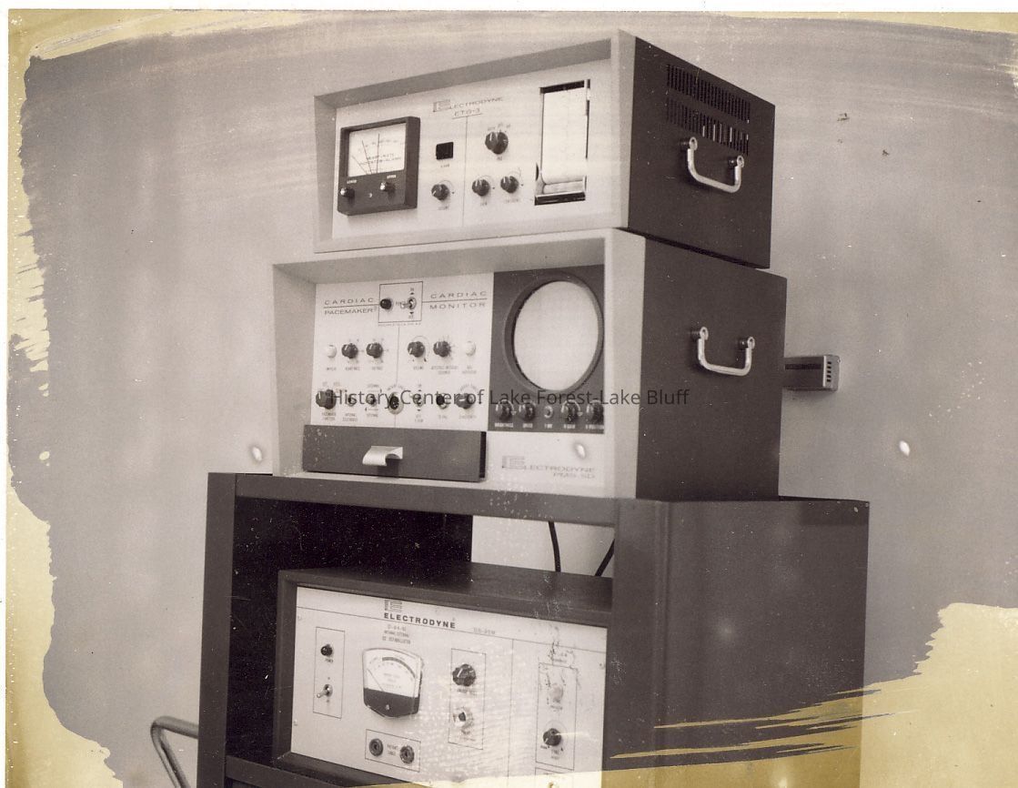 The image shows a stack of vintage electronic devices, including a cardiac monitor and a pacemaker, housed
