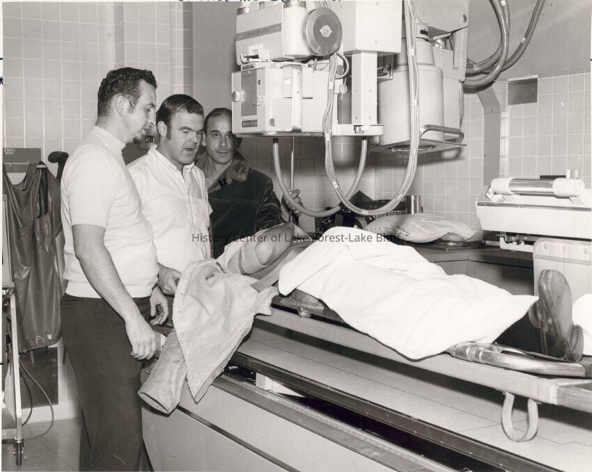 Three men, presumably one is the x-ray technician taking an x-ray of a male patient. Dr. Hoffman in the middle.