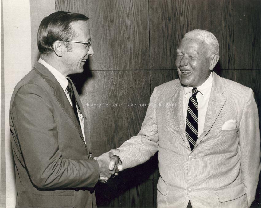 Lake Forest Hospital President George Caldwell shaking hands with unidentified man.