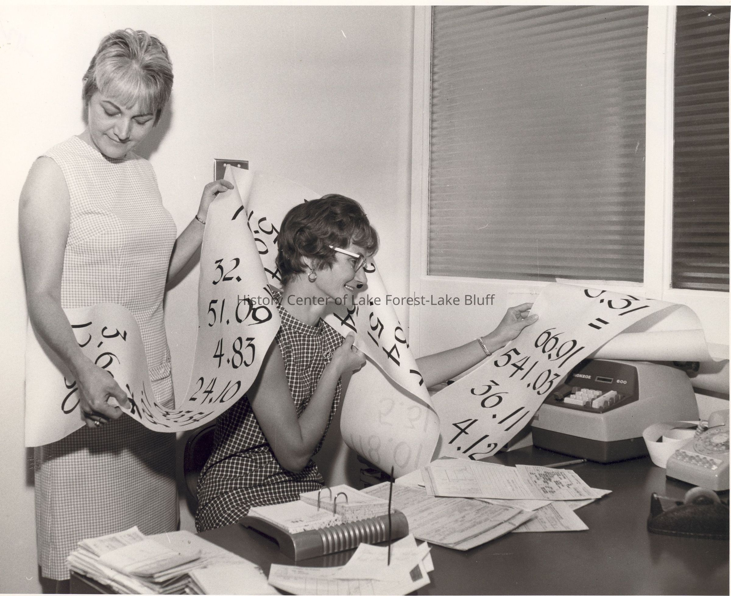 Two women examine oversized printed numbers at a desk with papers and machinery.