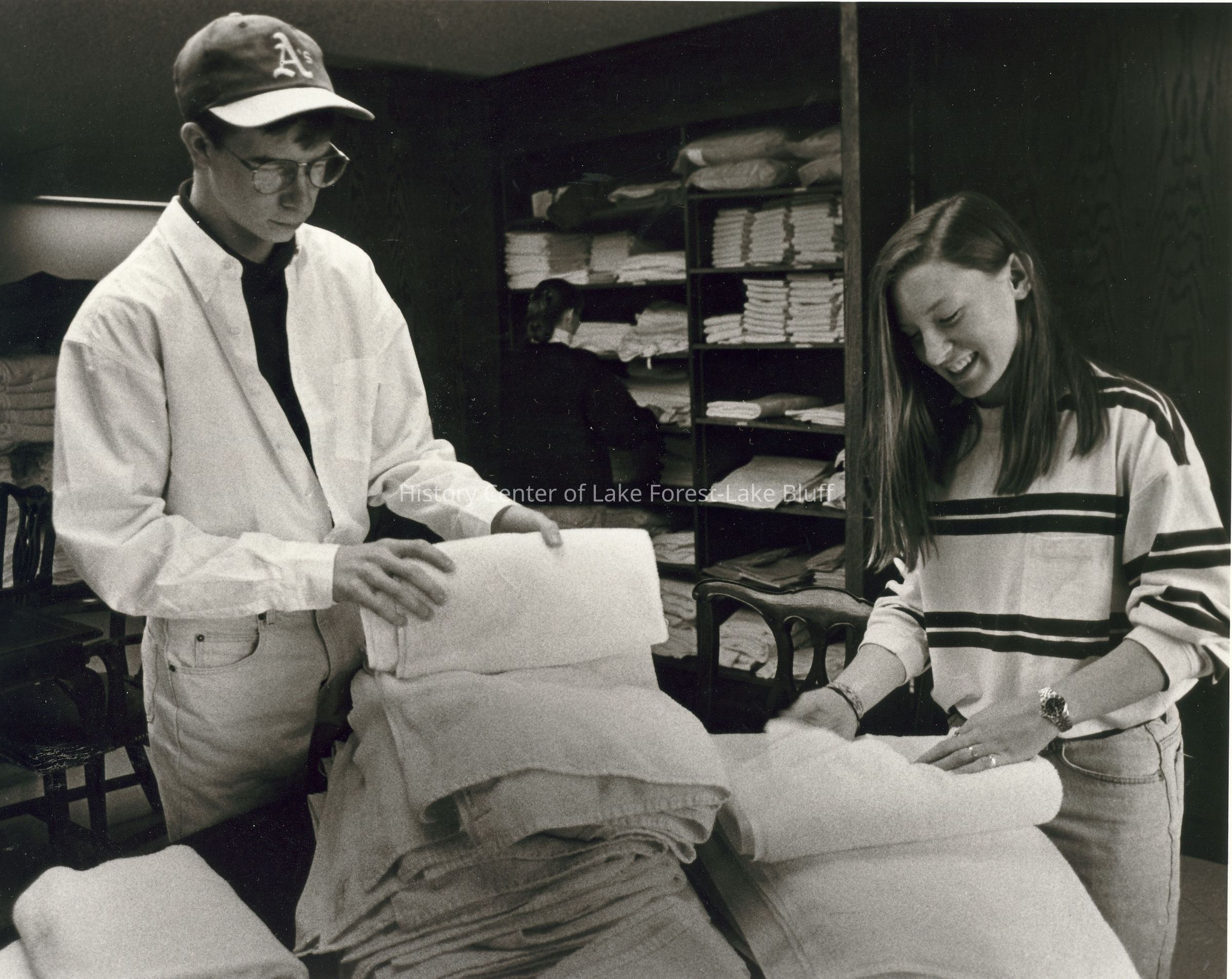 A young man and woman are folding towels together, smiling in front of shelves.