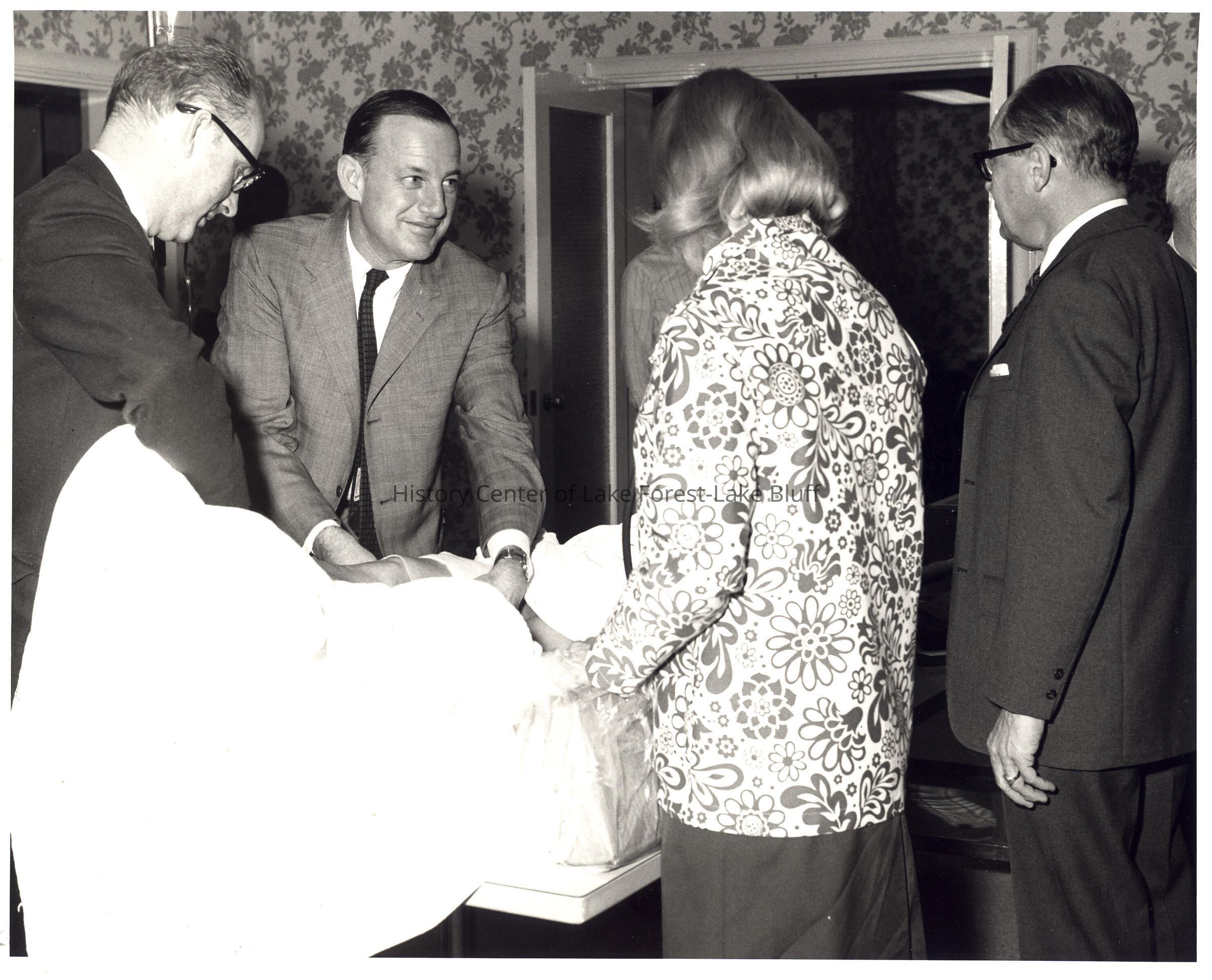 Three men in suits and one female at patients bedside. Photo has Dr. Apfelbach written. Folder is titled Disaster Drill.