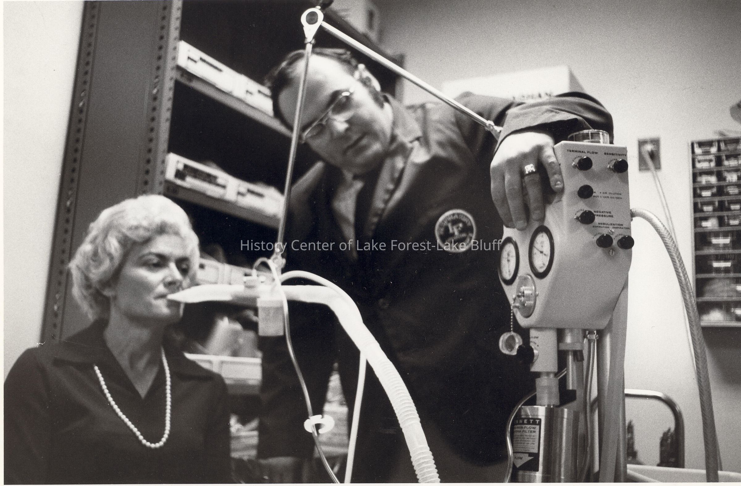 Male Inhalation Therapy clinician administering treatment to Ida Stanley, Director of Volunteers.
