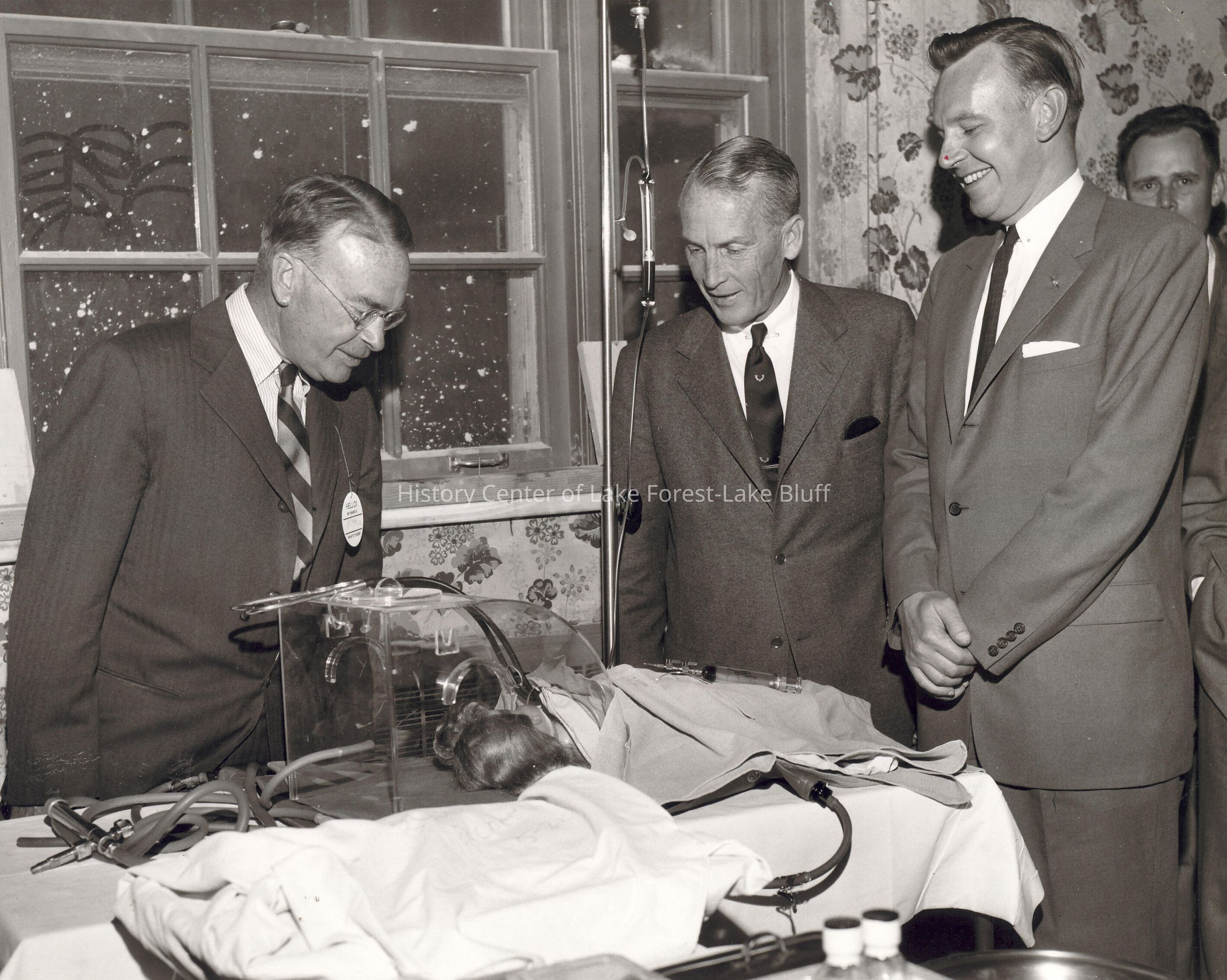 Right to left, Ernie Grey, Bill McIlvaine, Paul McBride observing infant incubator.