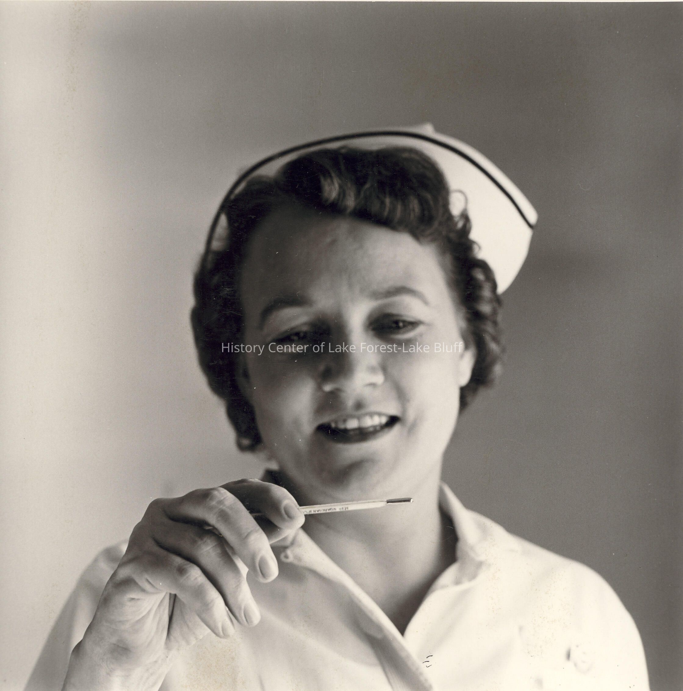 Nurse Mrs. Robinson, reading a thermometer.