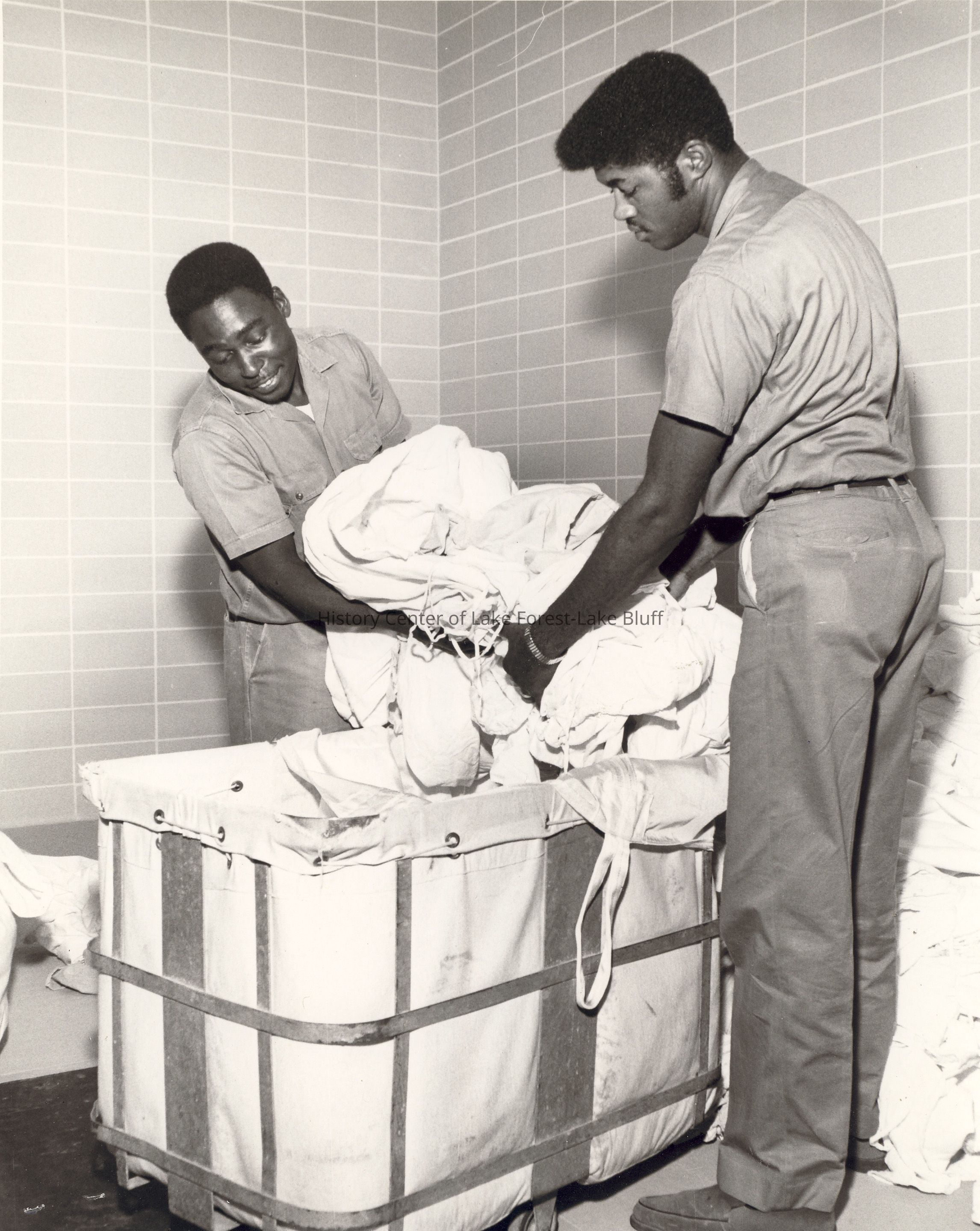 Two men in uniform are handling a large pile of laundry, smiling and working together efficiently.