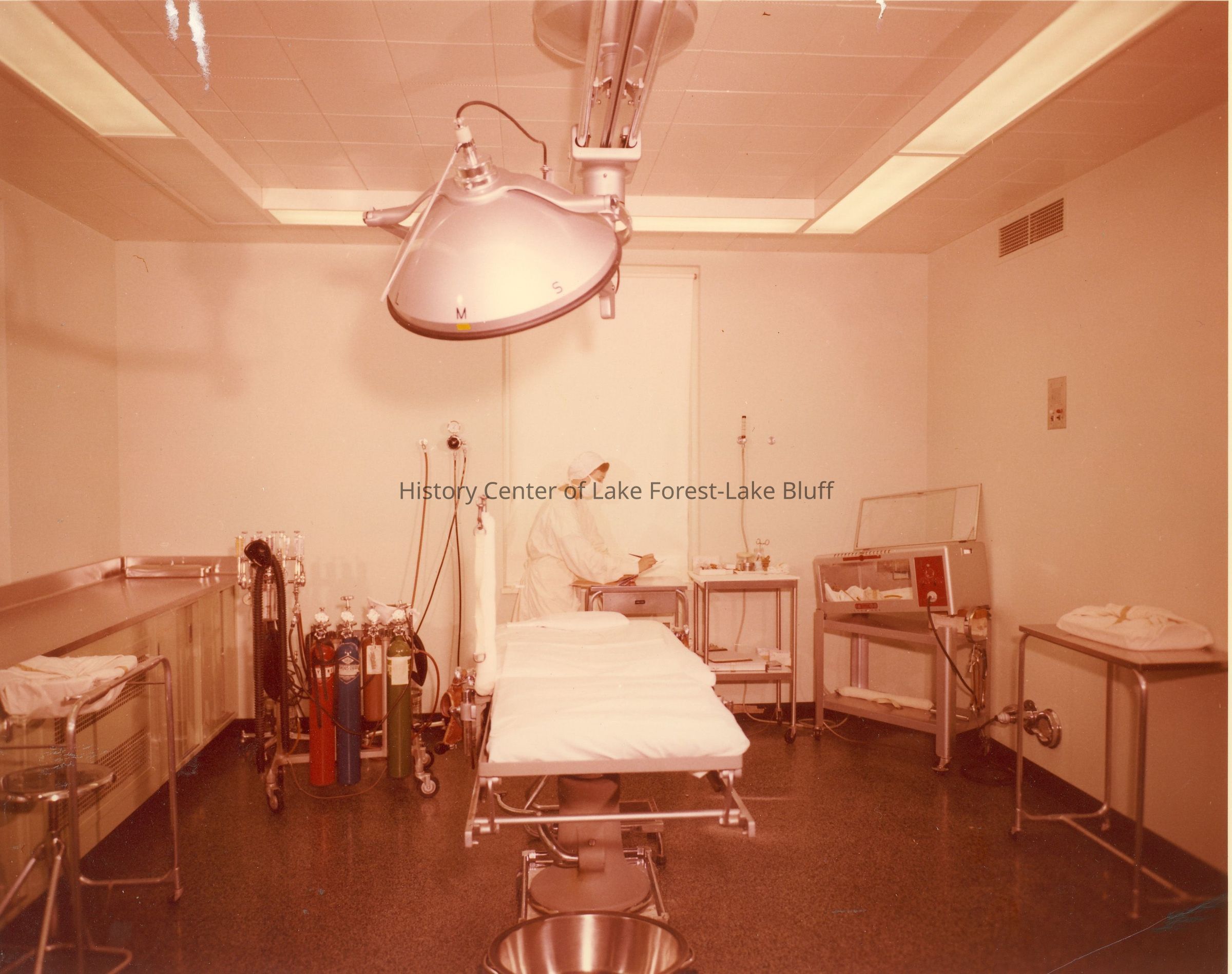 The image shows a vintage hospital operating room with medical equipment and a person wearing scrubs and a mask