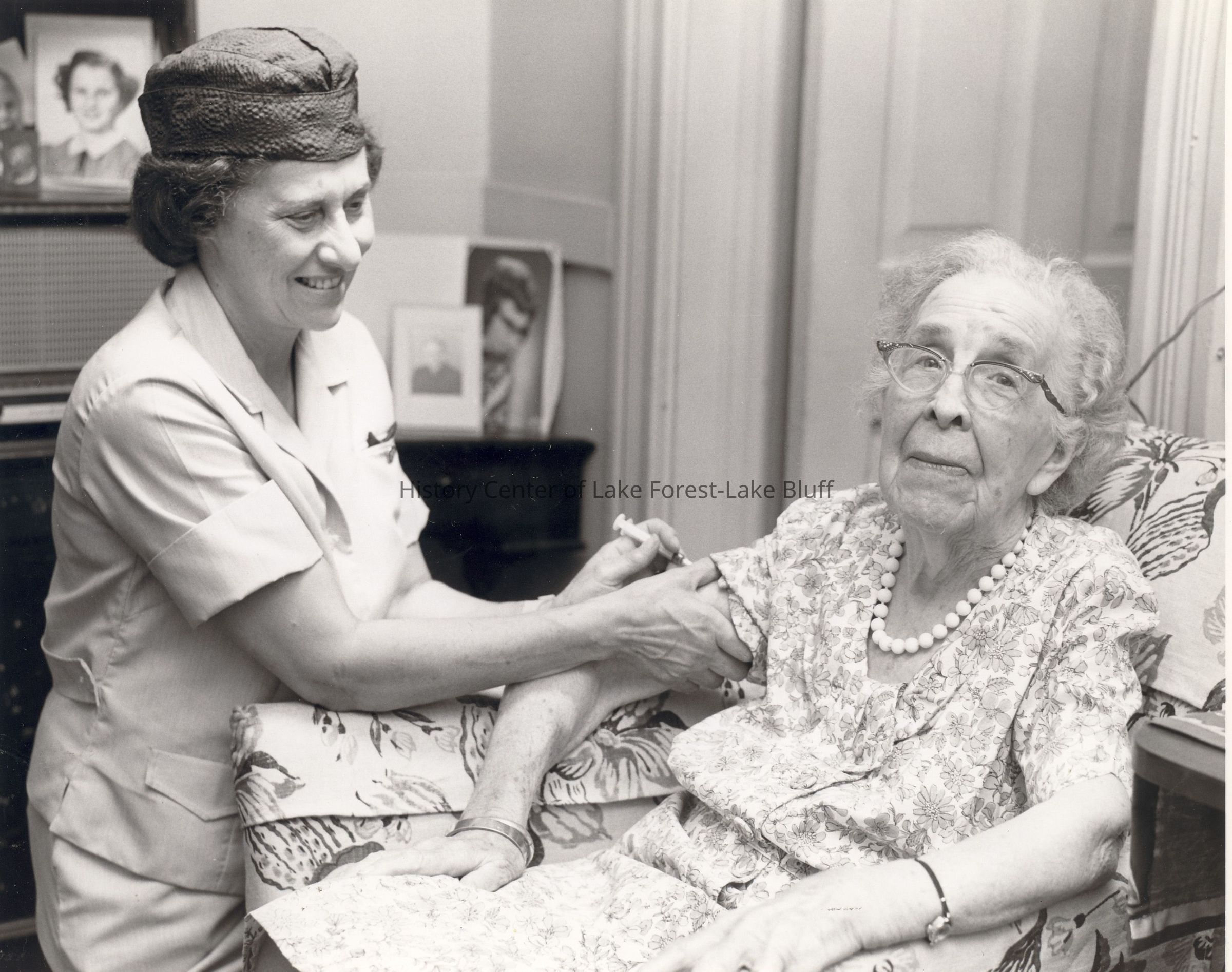 A nurse is gently administering a shot to an elderly woman sitting in a floral armchair.