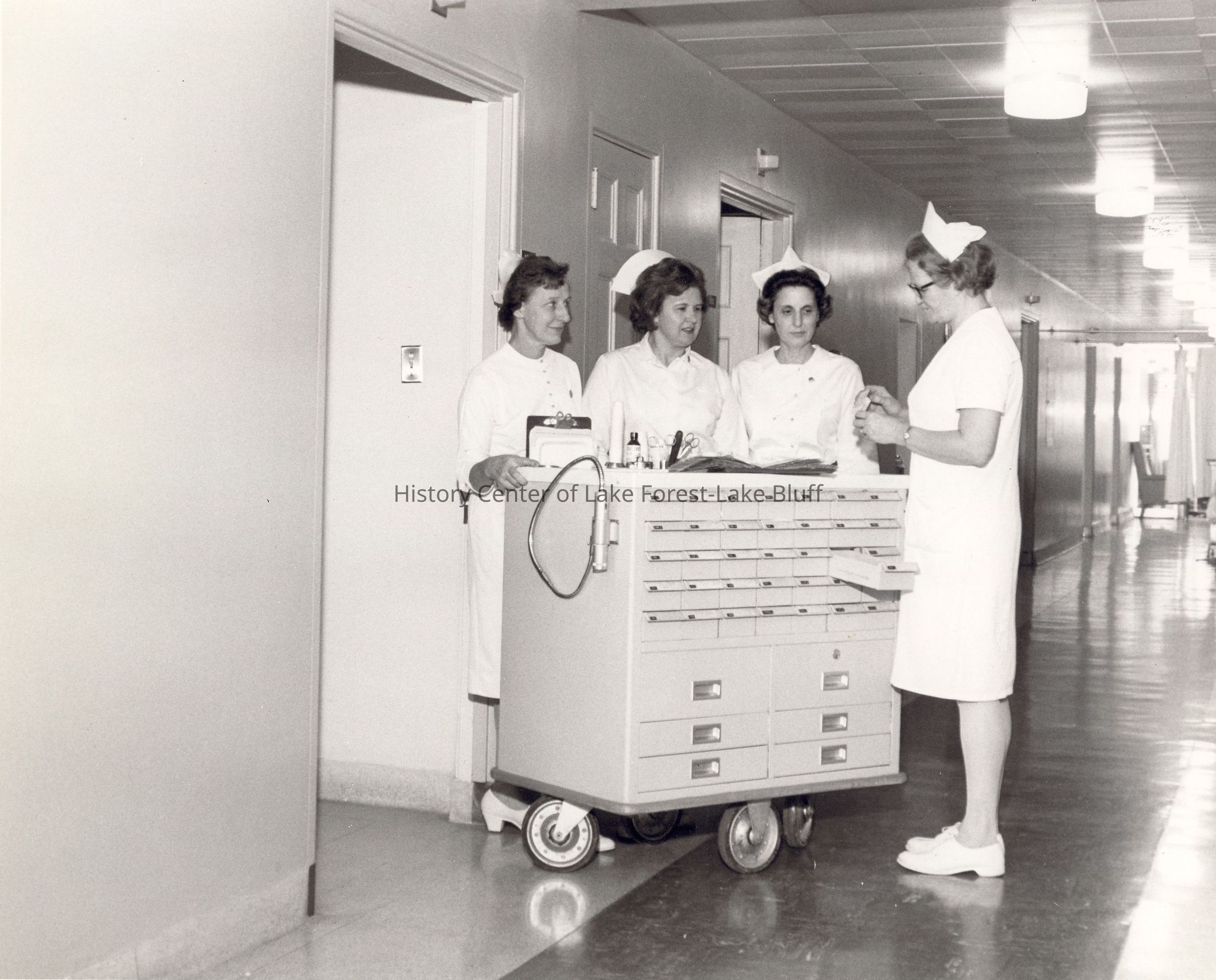 Four nurses stand beside a medical cart, engaged in conversation, in a hospital corridor.