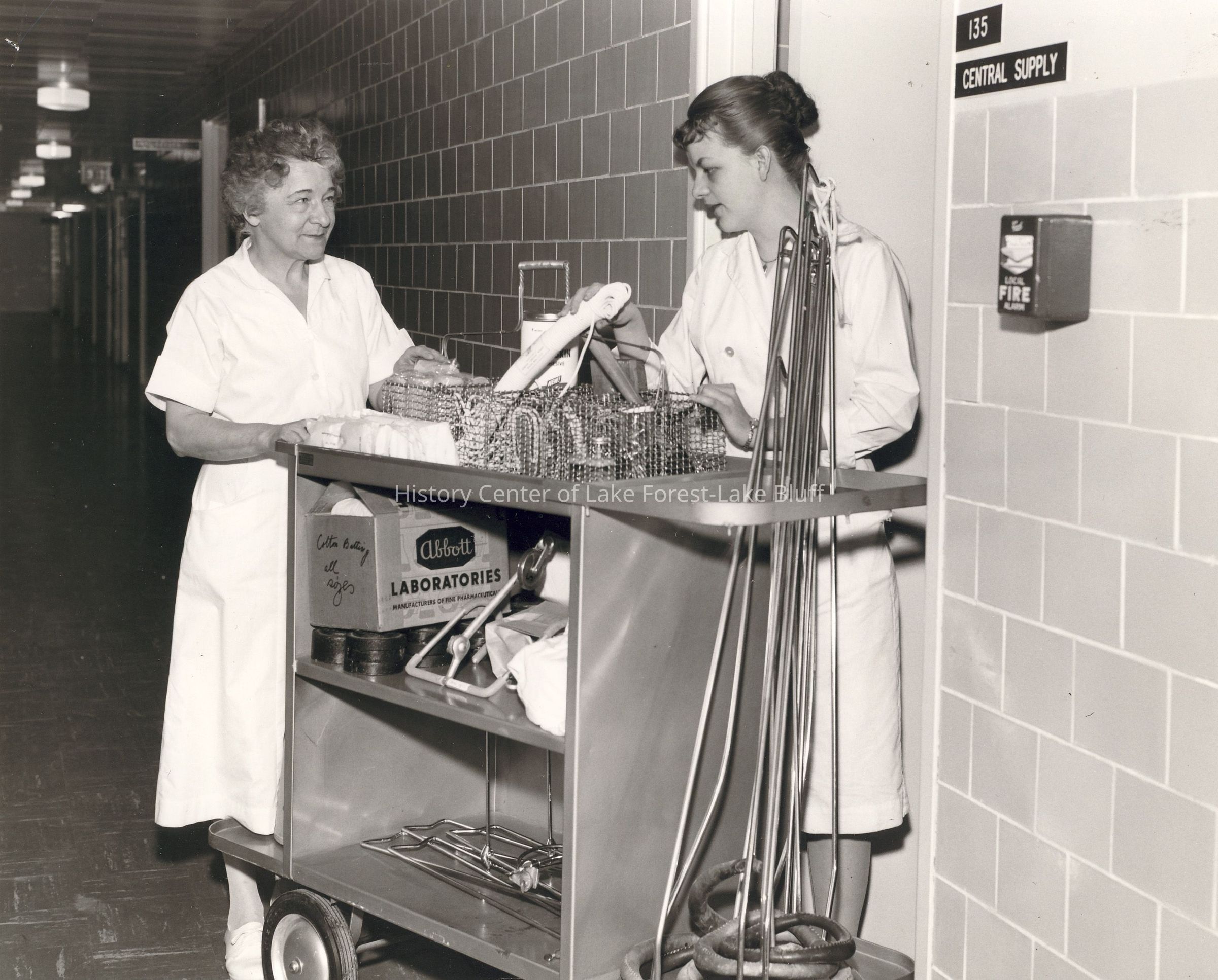 Two women in white uniforms work with medical equipment at a cart in a hospital hallway.