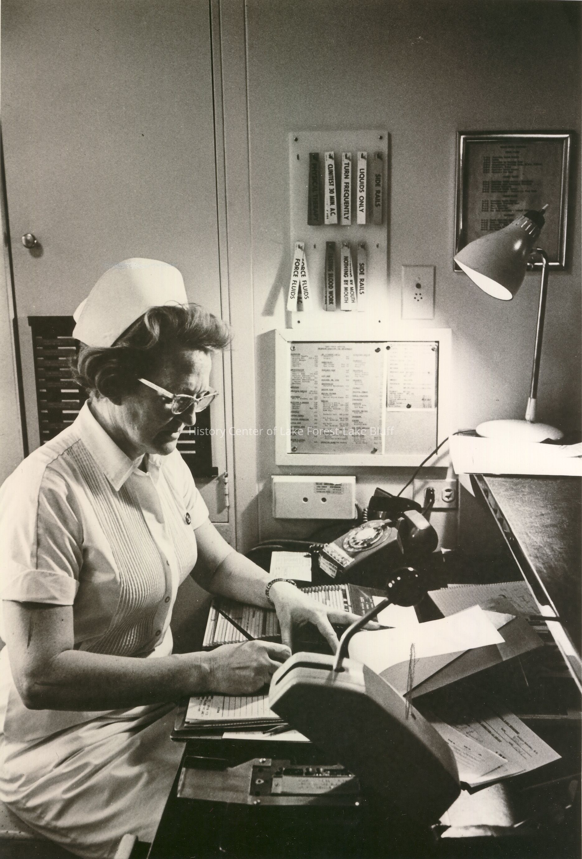 A nurse wearing a uniform is diligently working at a desk, surrounded by paperwork and a rotary phone.