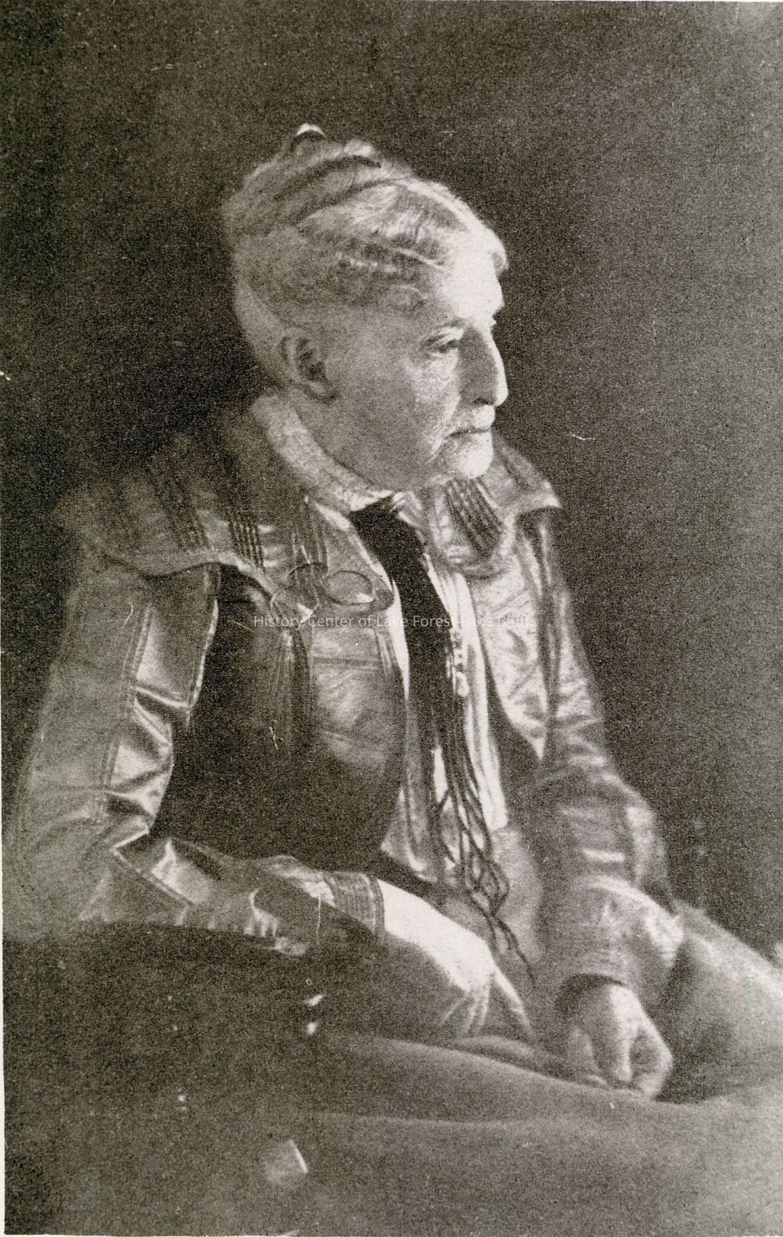 The black and white photo shows an elderly woman sitting, wearing vintage attire, looking contemplative.
